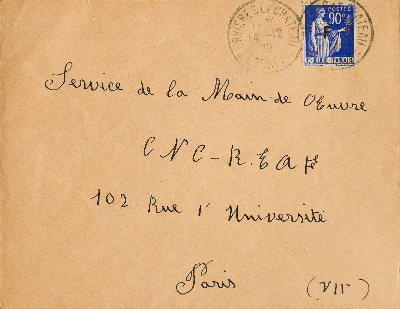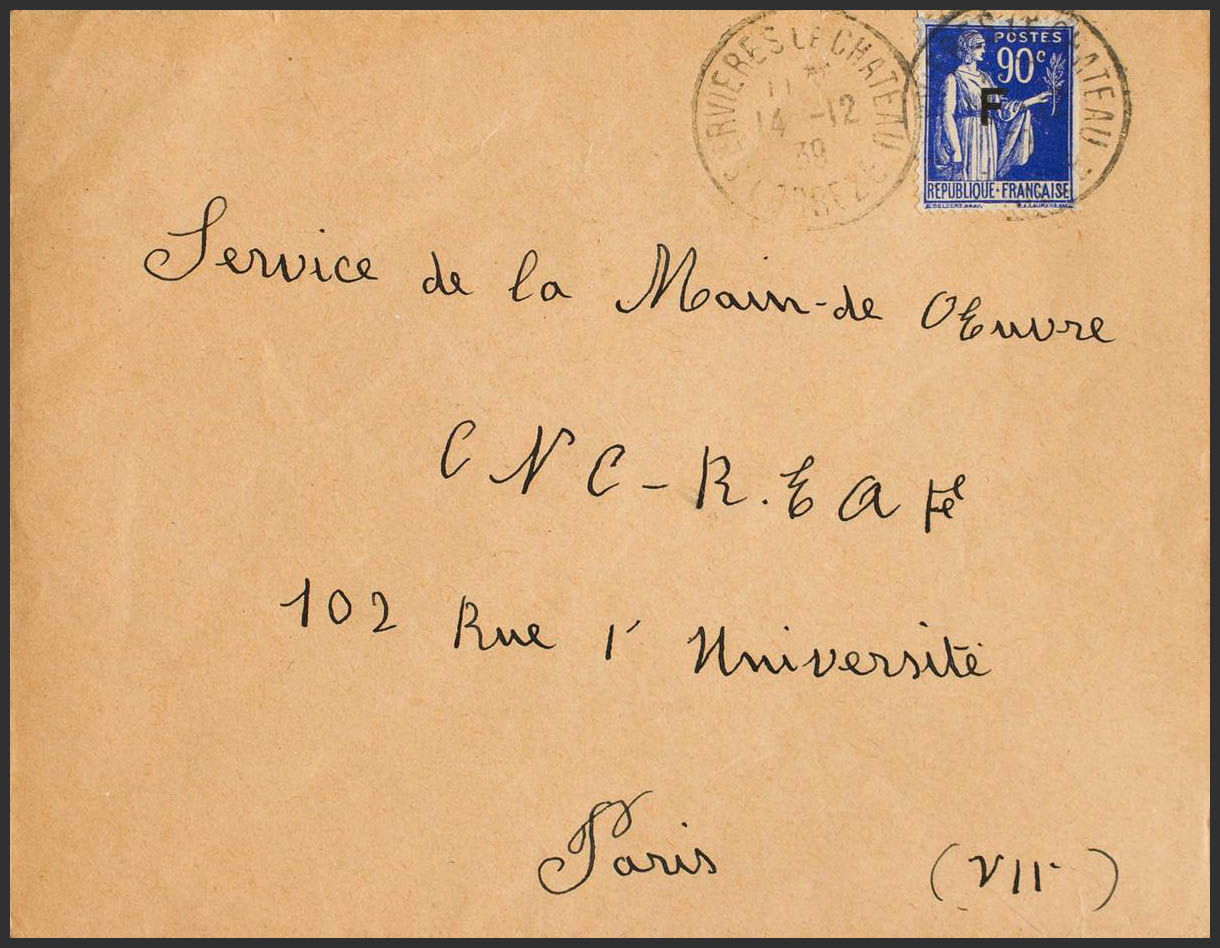 1939. Blue 90 cts from France with "F" surcharge. SERVIERES LE CHATEAU a PARIS (FRANCE), written by a Spanish interned in the Preventorio de Servieres, probably due to some illness, since this center was intended for the work of a prentorio-hospital. Postmark SERVIERES LE CHATEAU / CORREZE. MAGNIFICENT AND RARE.