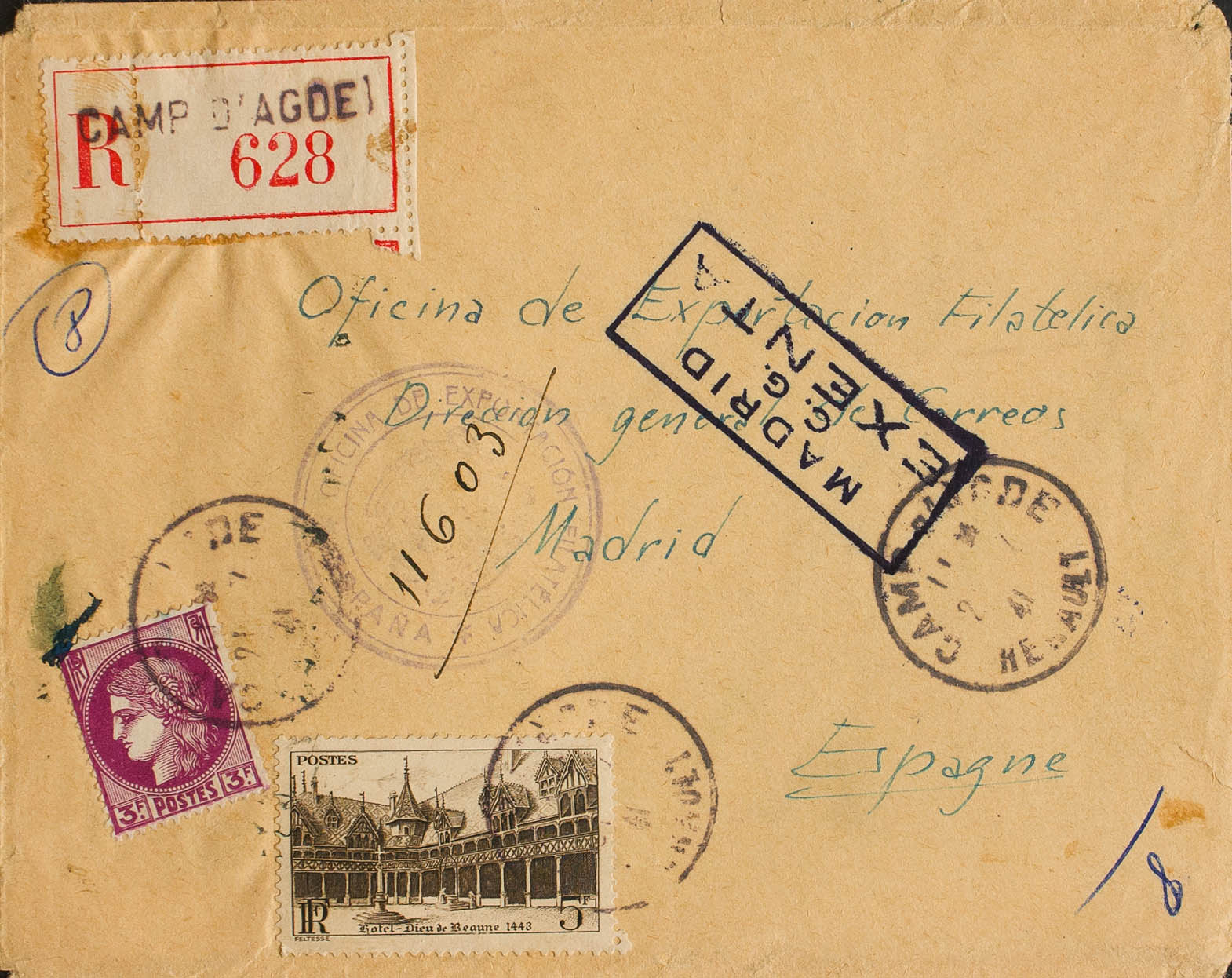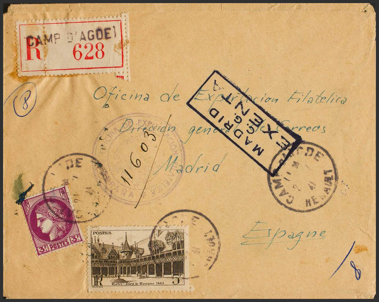 1941. 3 fr violet and 5 fr chestnut, both from France. Certificate from AGDE to MADRID. Postmark CAM D´AGDE / HERAULT and MADRID / GC / EXENTA mark on the front. After the departure of the Spanish refugees in 1940, it became a Concentration Camp for foreigners, this camp was dismantled in the fall of 1943. MAGNIFICENT AND RARE CERTIFIED LETTER FROM AN INTERNMENT CAMP.