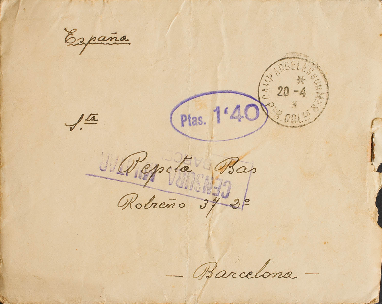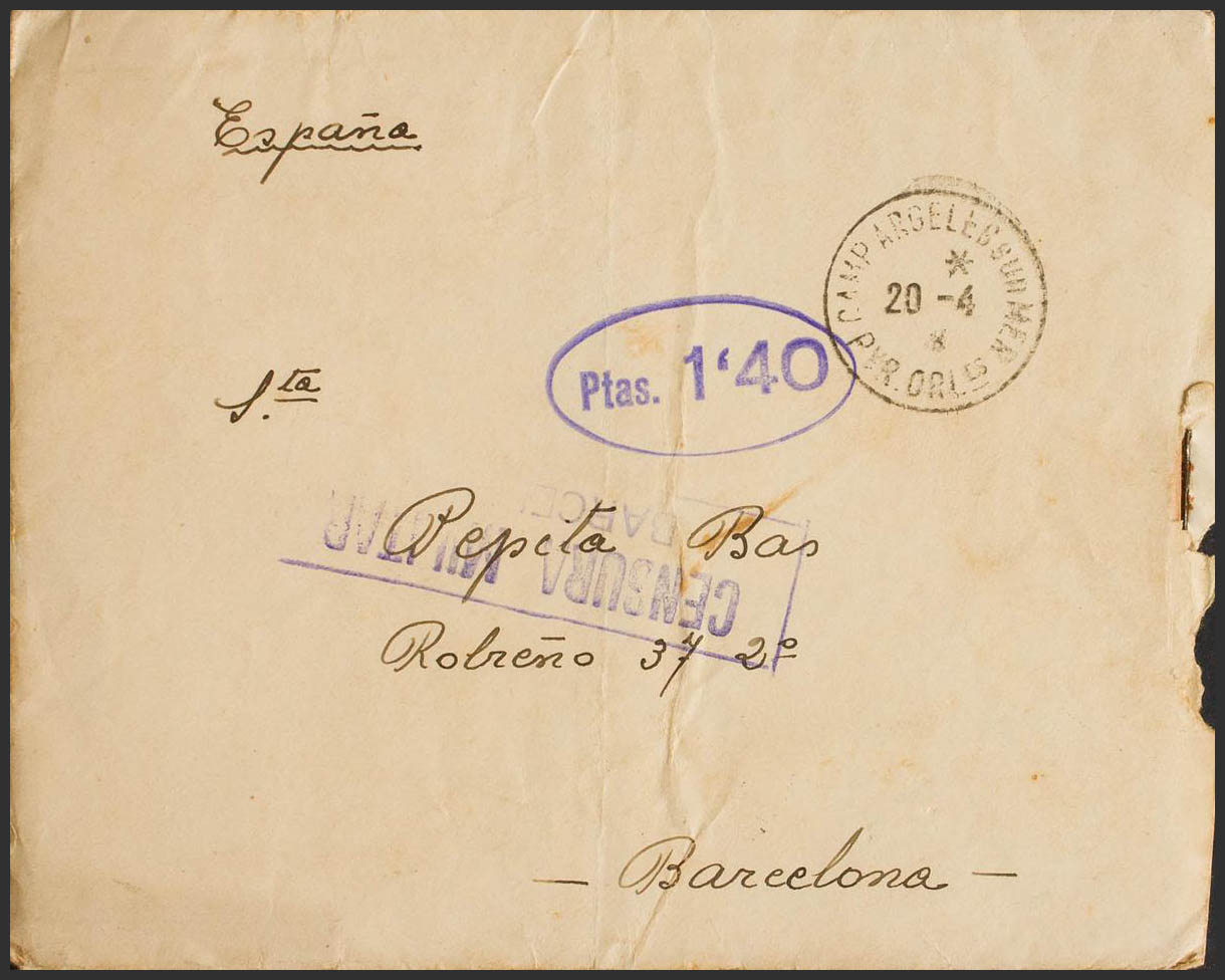 1939. ARGELES SUR MER in BARCELONA (text inside). CAMP ARGELES SUR MER / PYR.ORLES postmark and rate mark PTAS 1´40, in violet applied to the arrival and to the arrival back. MAGNIFICENT AND VERY RARE.