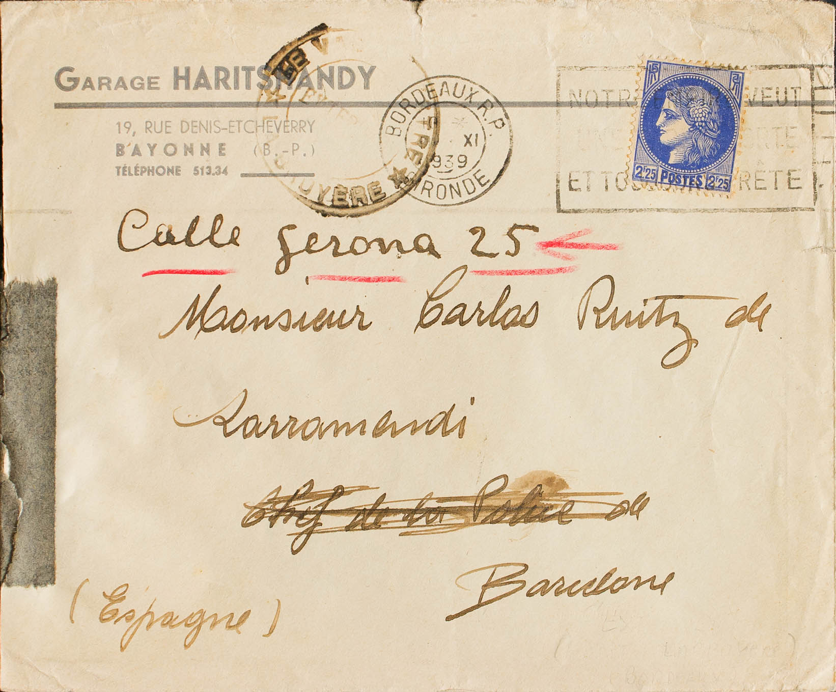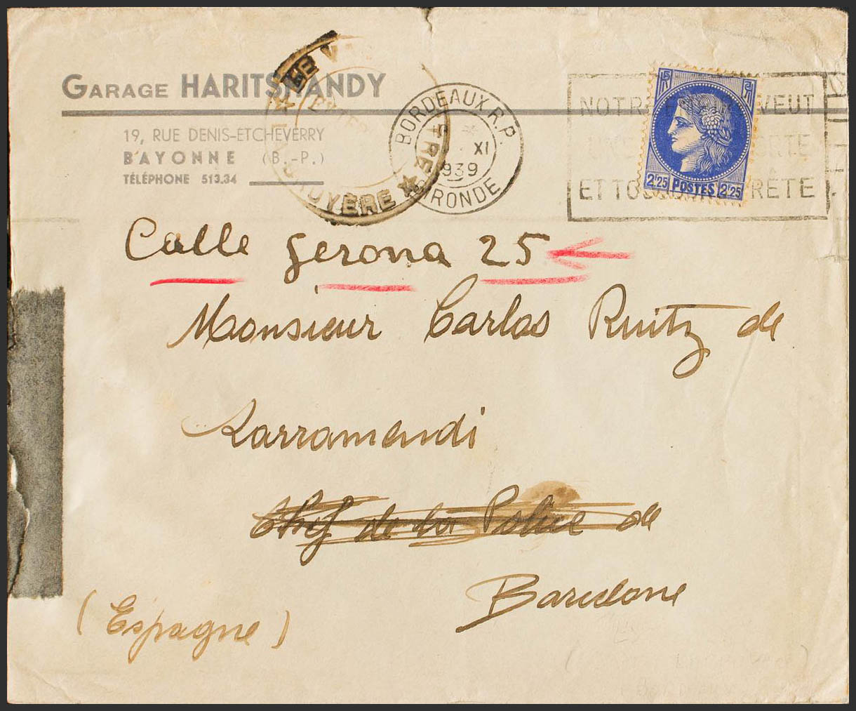 English 1939. 2´25 blue fr from France. BORDEAUX to BARCELONA, referred from the temporary hospital of La Bruyere. At the beginning of World War II, temporary hospitals were created to care for the wounded and refugees, among whom were many Spaniards, these were asylums, convents and even schools, as is the case, on the front marked LE VAGUEMESTRE / ESTERNAT / LA BRUYERE. MAGNIFICENT AND RARE.