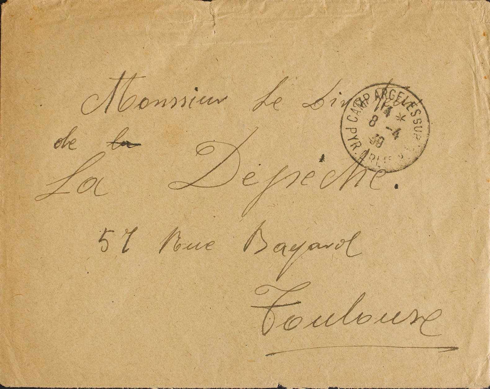 English 1939. ARGELES SUR MER to TOULOUSE. Postmark CAMP ARGELES SUR MER / PYR.ORLES. MAGNIFICENT.