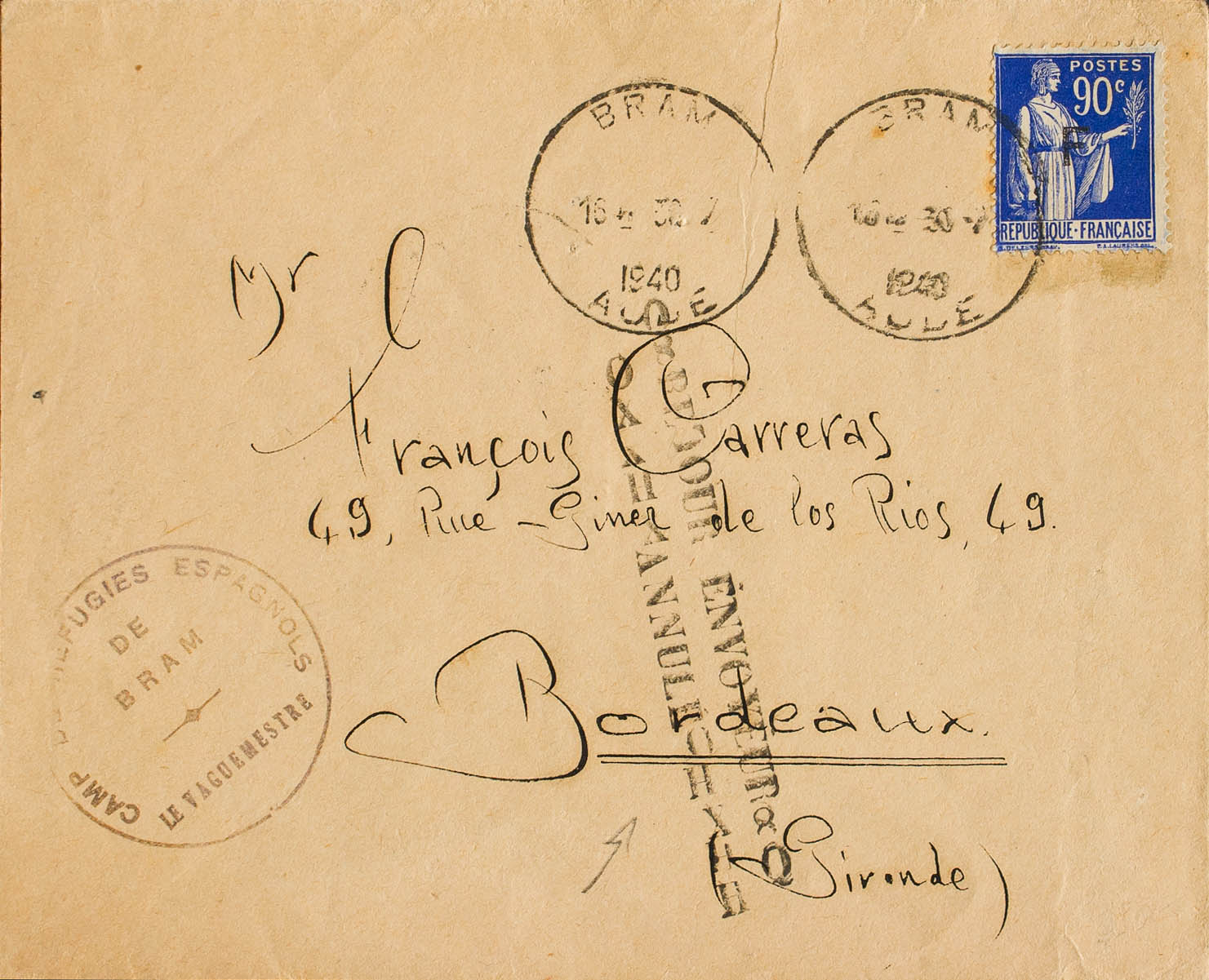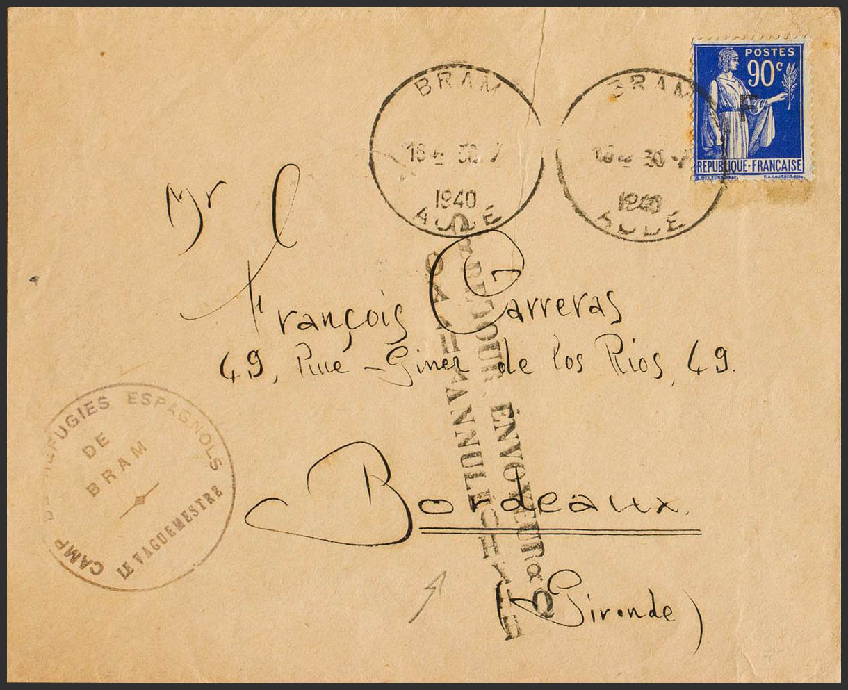 English 1940. 90 cts blue France, overprint F. BRAM to BORDEAUX (written by a Spanish interned in Campo de Bram). Postmark BRAM / AUDE and marks CAMP DE REFUGIES ESPAGNOLS / DE BRAM LE VAGUEMESTRE and RETOUR ENVOYEUR / ANNULE on the front, arrival at the Bram camp a month and a few days later on the back. MAGNIFICENT AND RARE.