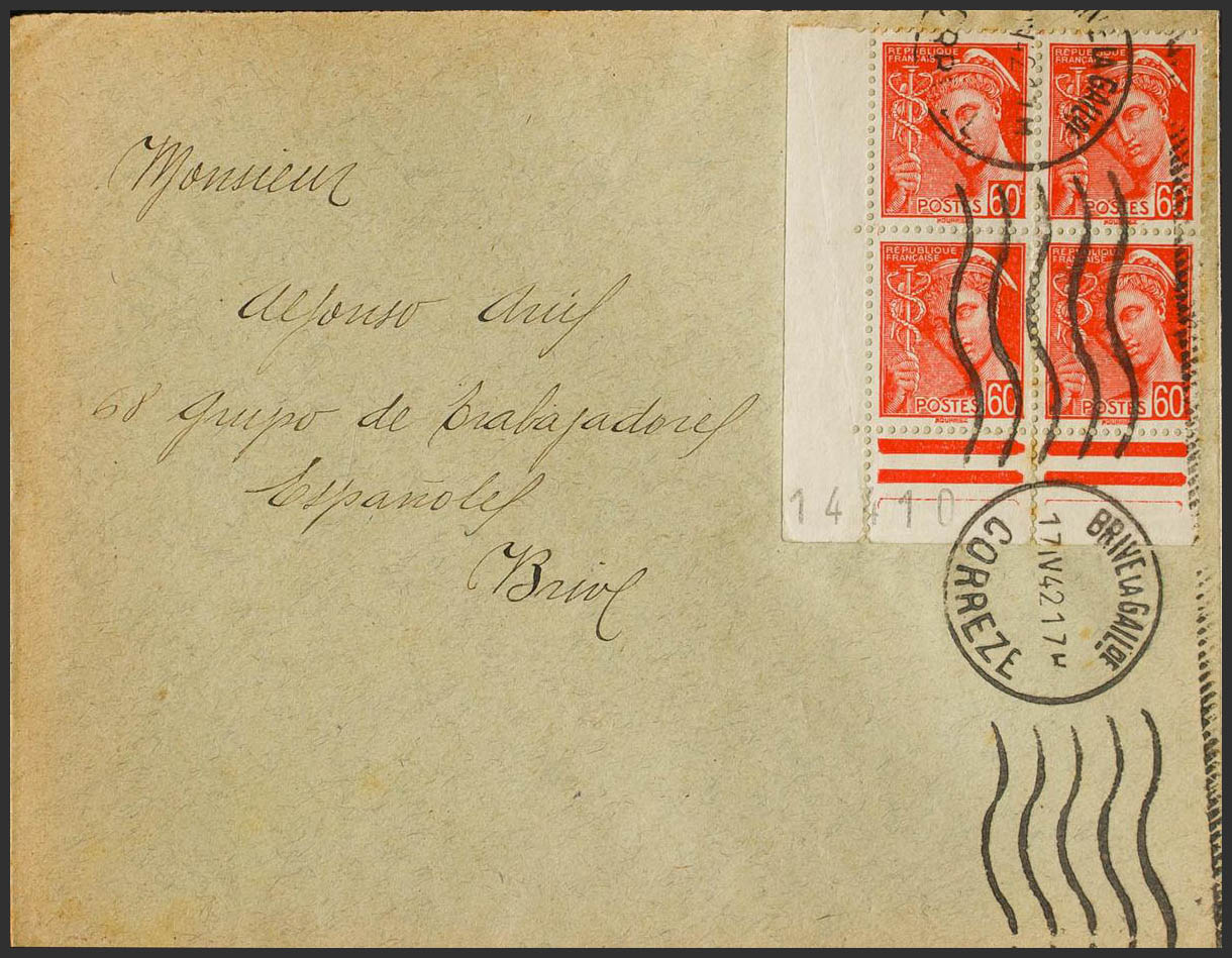 1942. 60 orange cts, block of four. CORREZE to BRIVE (addressed to a Spaniard from the Group of Foreign Workers Nº68). MAGNIFICENT AND RARE.