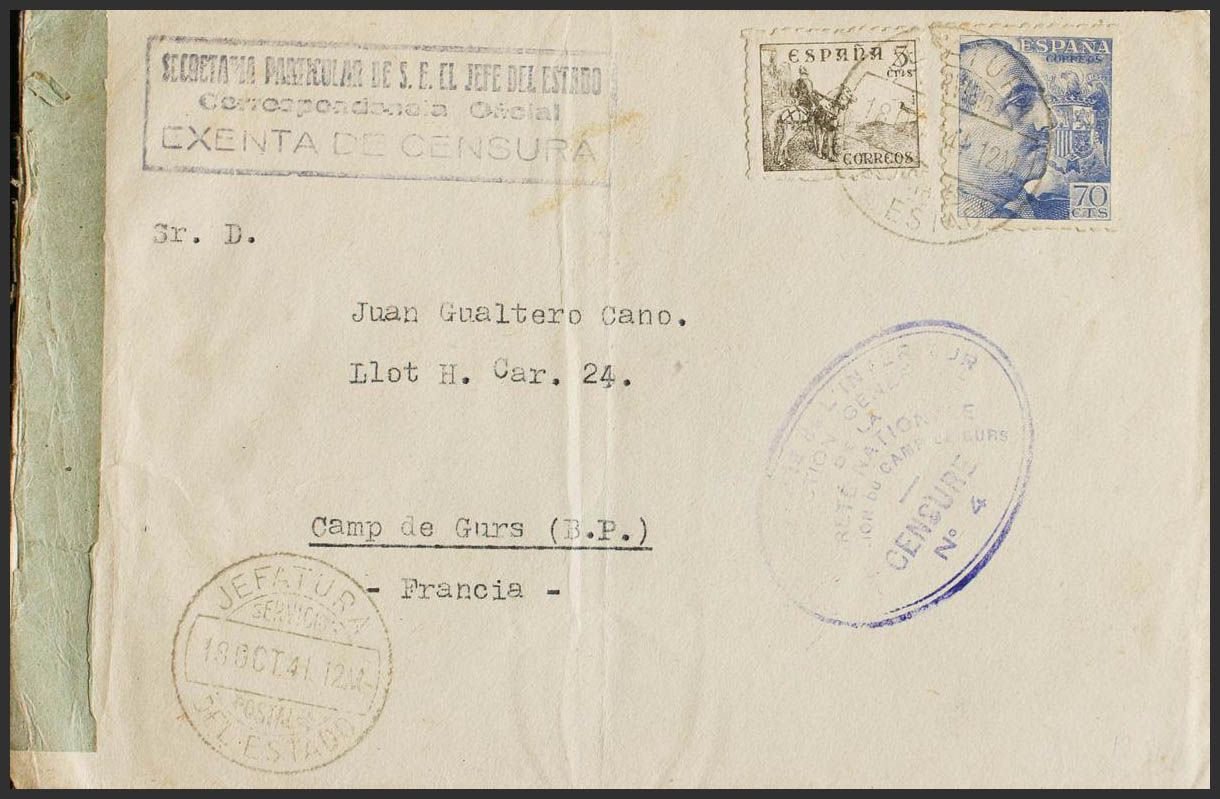 1941. 70 cts blue and 5 cts sepia. MADRID to GURS (sent from the Private Secretariat of HE the Head of State and addressed to the Gurs Refugee Camp to Juan Gualtero Cano, a former Republican officer who, upon leaving the Gurs camp, emigrated to Monterrey in Mexico where he dedicated himself to the philatelic trade ). On the front, MINISTERE DE L´INTERIEUR / DIRECTON GENERALE / DE LA SURETE NATIONALE / DIRECTION DU CAMP DE GURS / CENSURE / Nº4, in purple. MAGNIFICENT AND VERY RARE.
