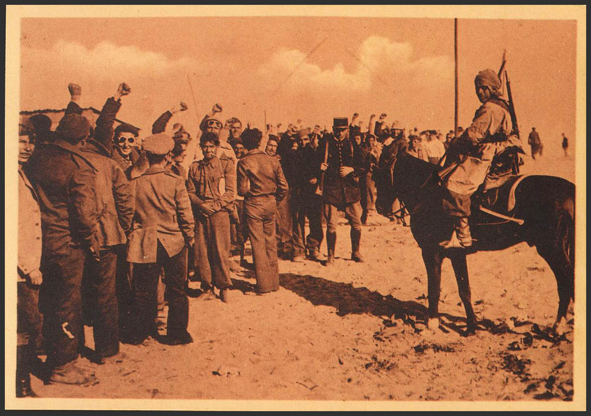 (★)(1939ca). Illustrated Postcard (unused) of the Argeles Sur Mer Refugee Camp (refugees queuing). MAGNIFICENT AND RARE.