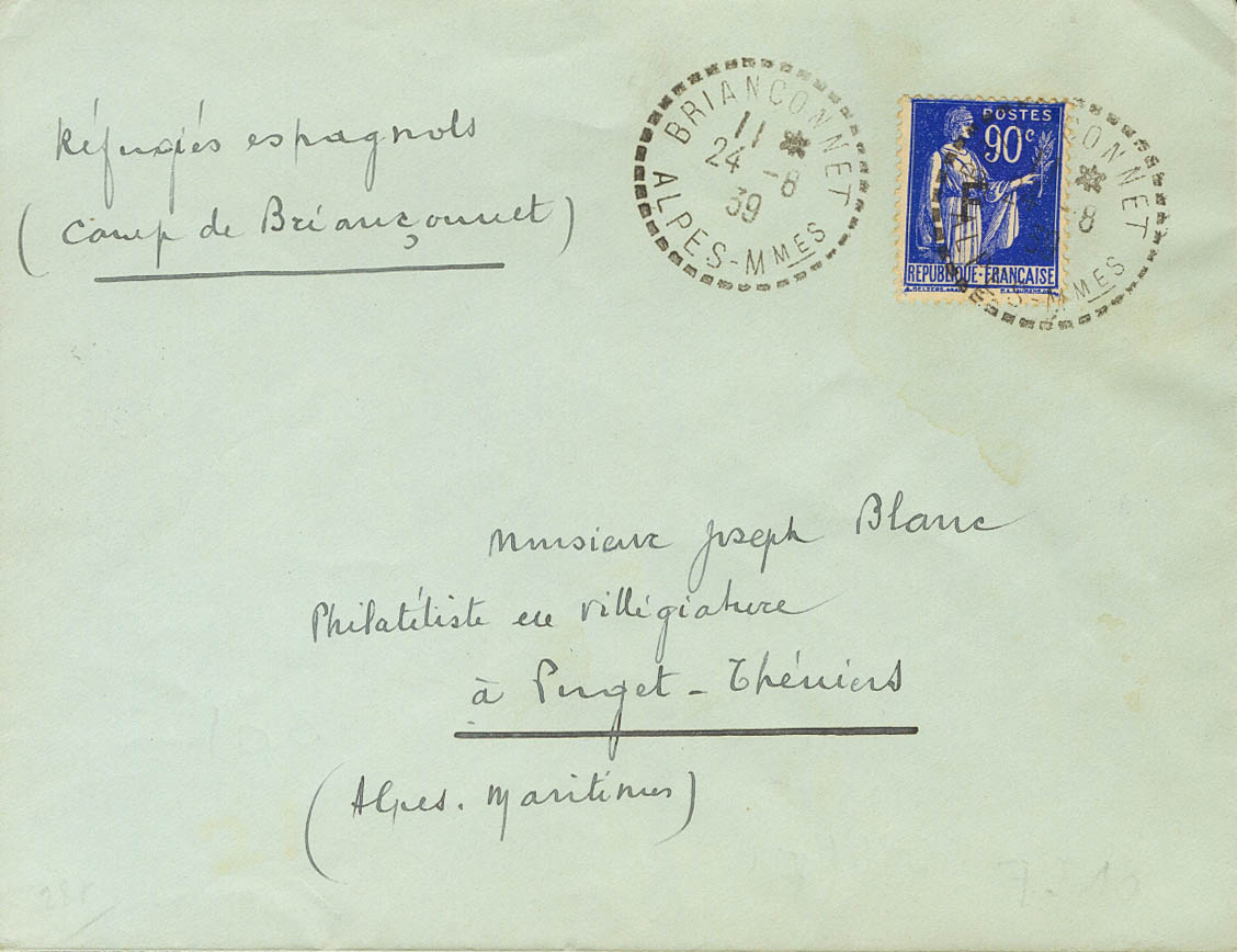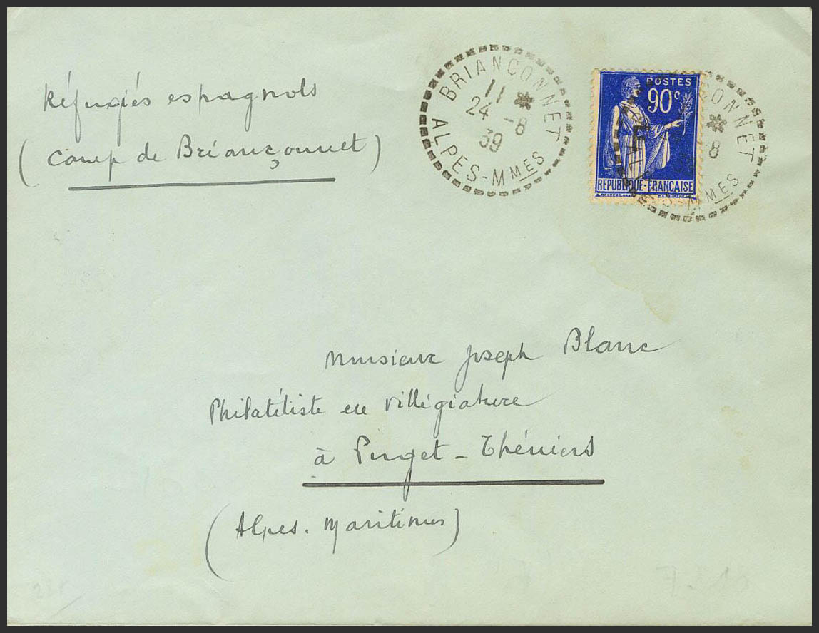 1939. France stamp of 90 cts blue with "F" surcharge. BRIANCONNET to PUGET THENIERS. The Brianconnet Camp lacked a special mark, so it was mentioned in a handwritten form "Refugiés espagnols (Camp de Brianconnet)", on the back arrival. MAGNIFICENT.