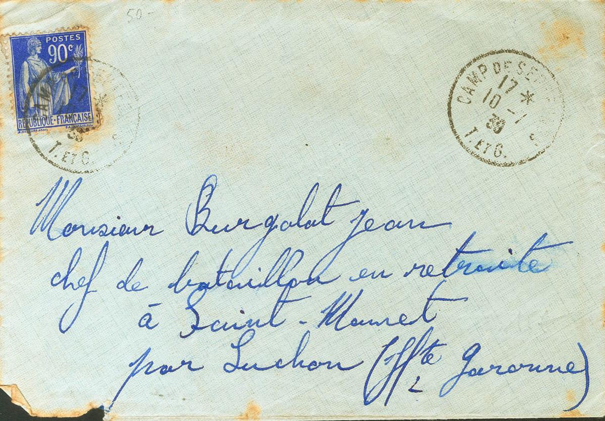 English |ABOUT|1939. 90 cts blue from France (most likely reused). SEPTFONDS to SAINT MAMET. Postmark CAMP DE SEPTFONDS / TETG, NICE AND RARE.
