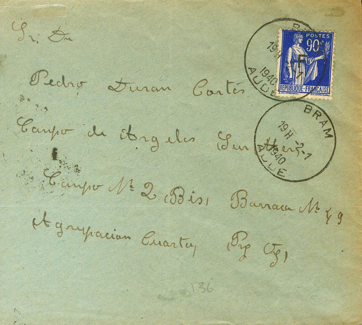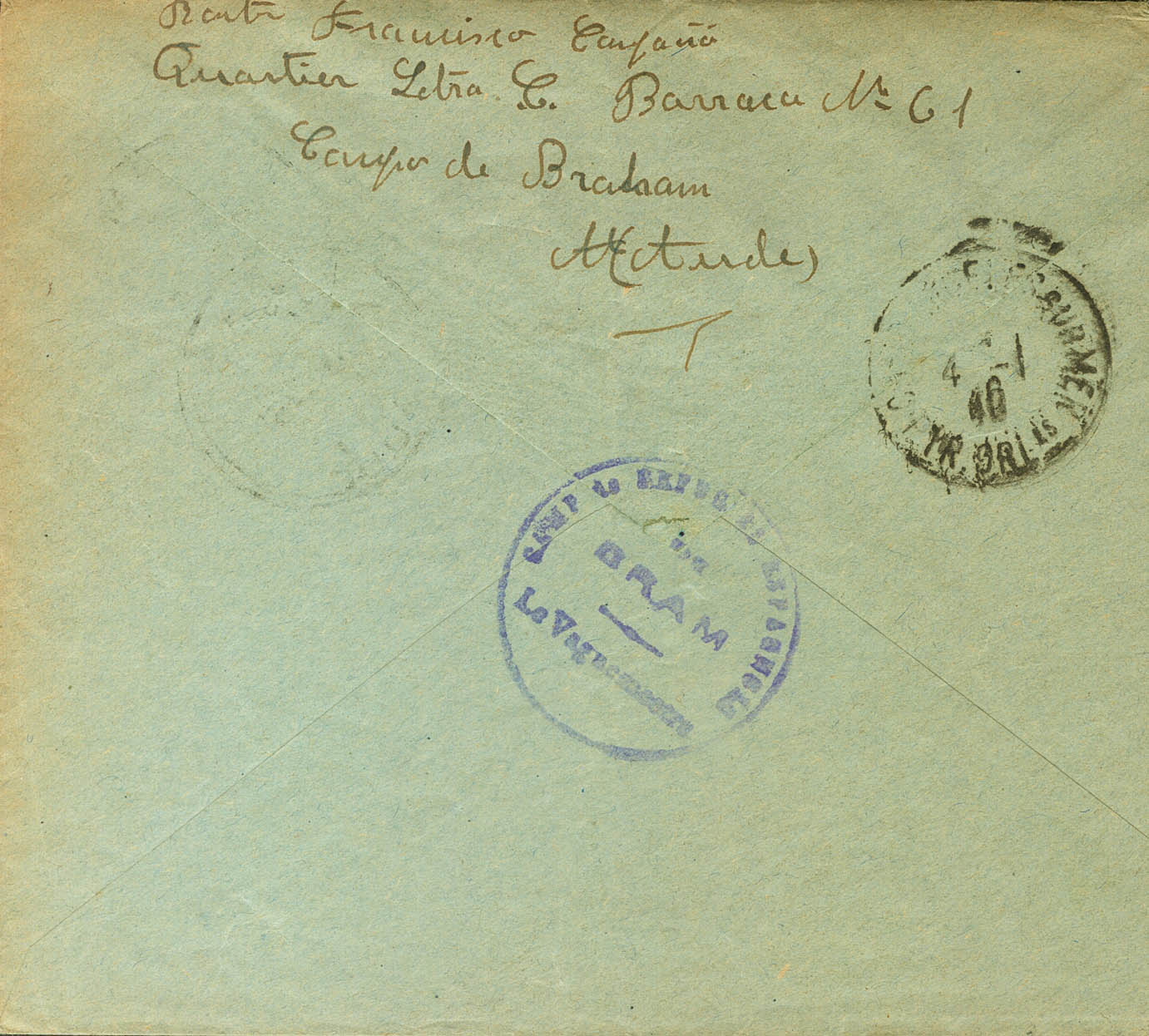 English |ABOUT|1940. 90 cts blue from France, overprint F. BRAM to ARGELES SUR MER, sent by a Spanish refugee from Campo de Brans to another from Campo de Argeles Sur Mer. Postmark BRAM / AUDE, on the back mark CAMP DE REFUGIES ESPAGNOLS / DE / BRAM / LE VAGUEMESTRE, in violet and arrival. MAGNIFICENT AND VERY RARE CIGoodULATED BETWEEN DIFFERENT INTERNMENT OR REFUGEE CAMPS.
