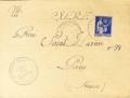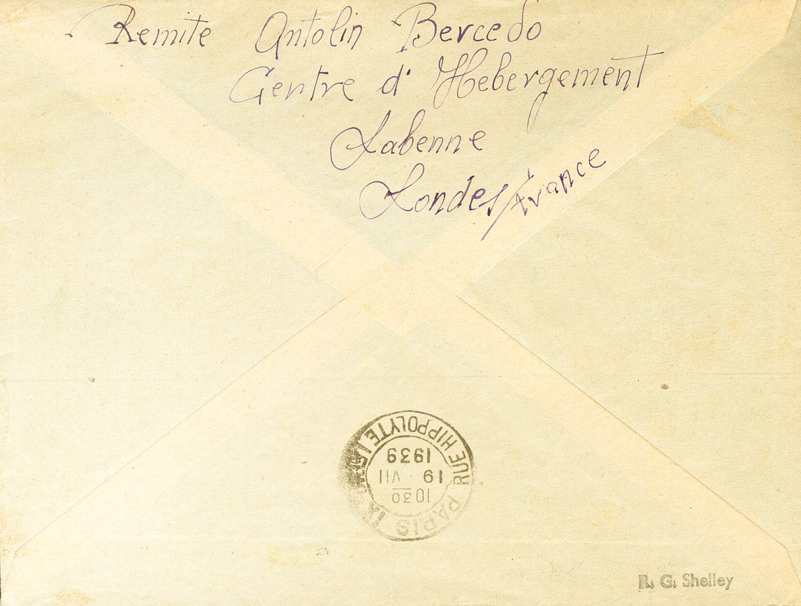 |ABOUT|1939. 90 cts blue from France, surcharge F. LABENNE to PARIS, sent by a Spanish refugee interned in a temporary Accommodation Centre in Labenne. On the front it says COMMUNE DE LABENNE / SERVICE / DES / REFUGIES / (LANDES), on the back it says arrival. MAGNIFICENT AND VERY RARE.
