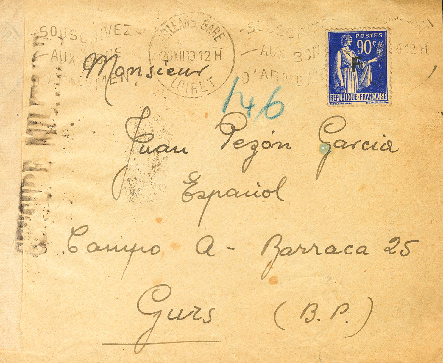 English |ABOUT|1939. 90 cts blue from France, overprint F. LES AYDES to GURS, sent by a Spanish refugee from the Temporary Accommodation Centre of Verrerie de Les Aydes (Orléans), a former glass factory converted into a reception centre and addressed to the Camp. MAGNIFICENT AND VERY RARE ORIGIN, ESPECIALLY RARE ADDRESSED TO ANOTHER REFUGEE CAMP.