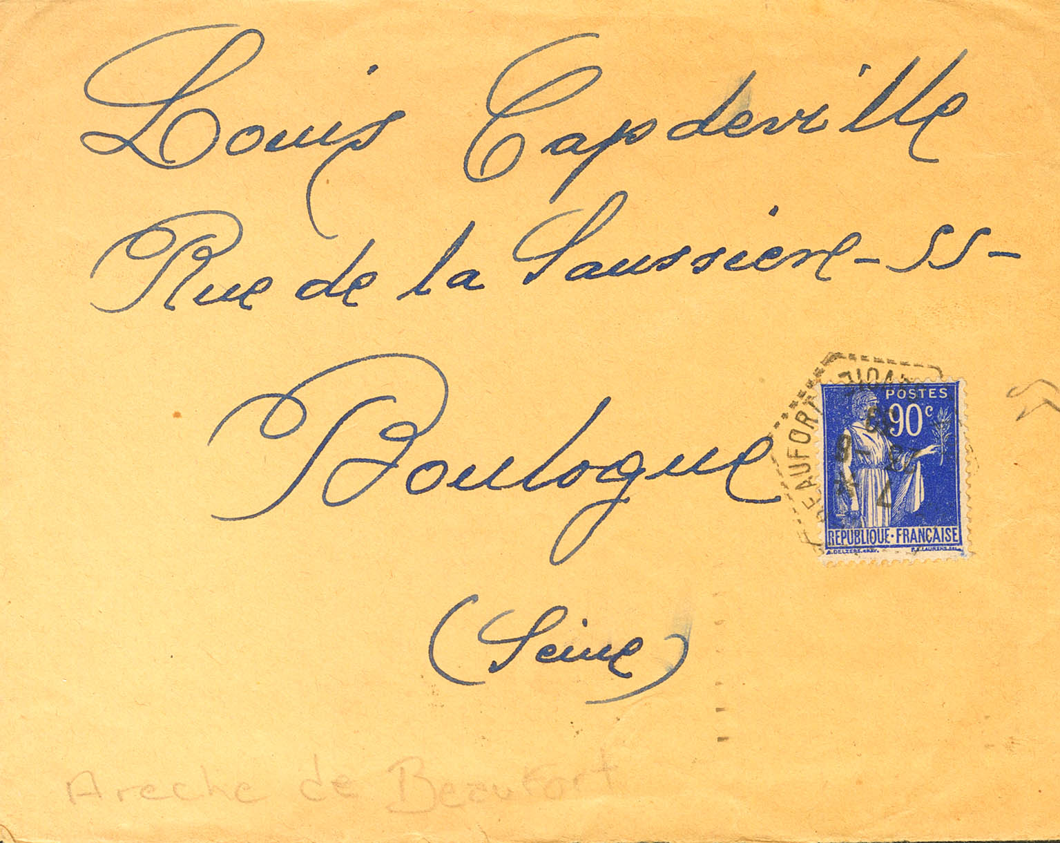 |ABOUT|1939. 90 cts blue from France. ARECHE-BEAUFORT to BOULOGNE, sent by a Spaniard from the 40th Company of Spanish Workers. MAGNIFICENT AND RARE.