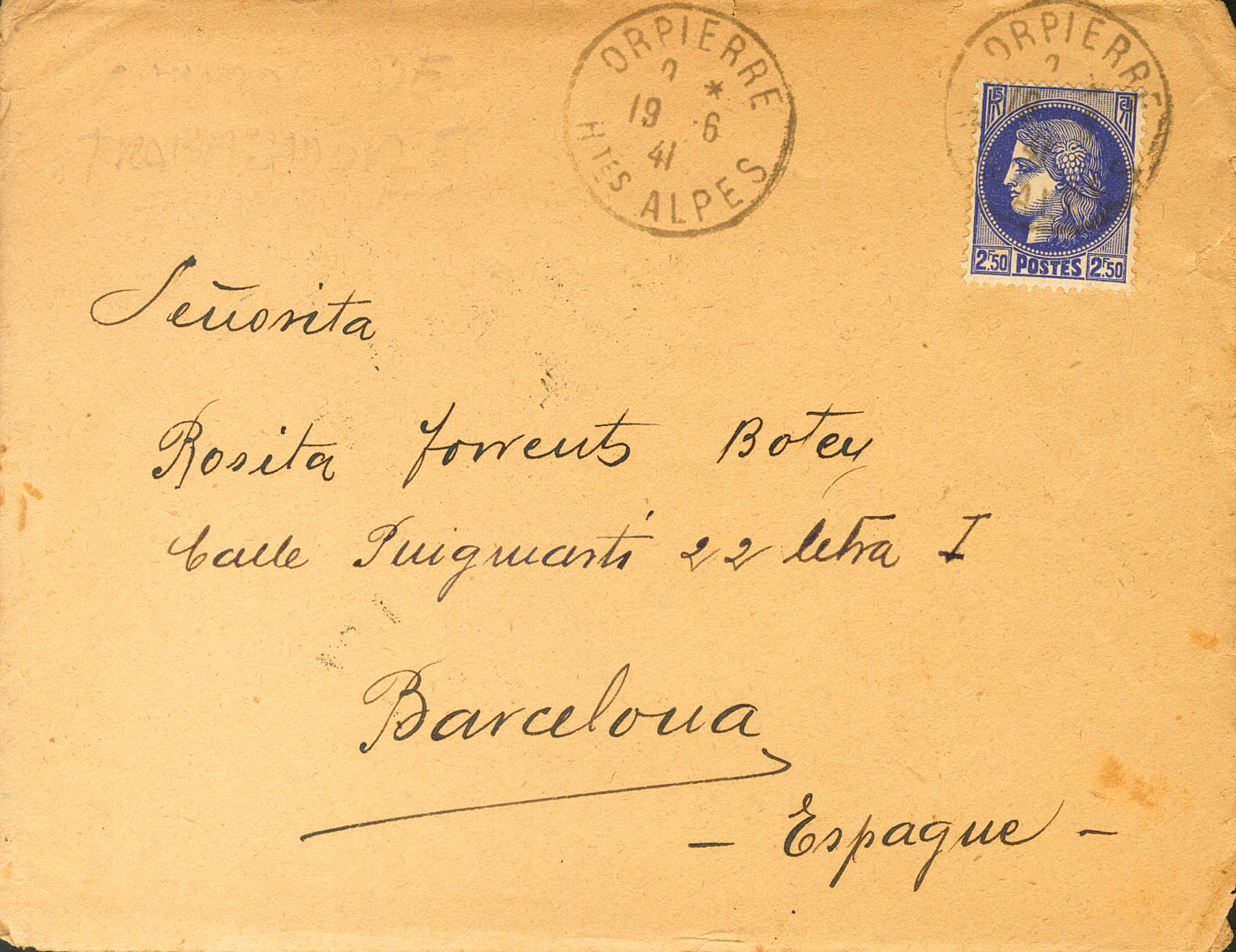 |ABOUT|1941. 2´50 f blue from France. Letter (with text) from ORPIERRE to BAGoodELONA, sent by a Spanish nurse from the 95th Spanish Workers Group, established in this small town in the Hautes-Alpes department. MAGNIFICENT AND RARE.