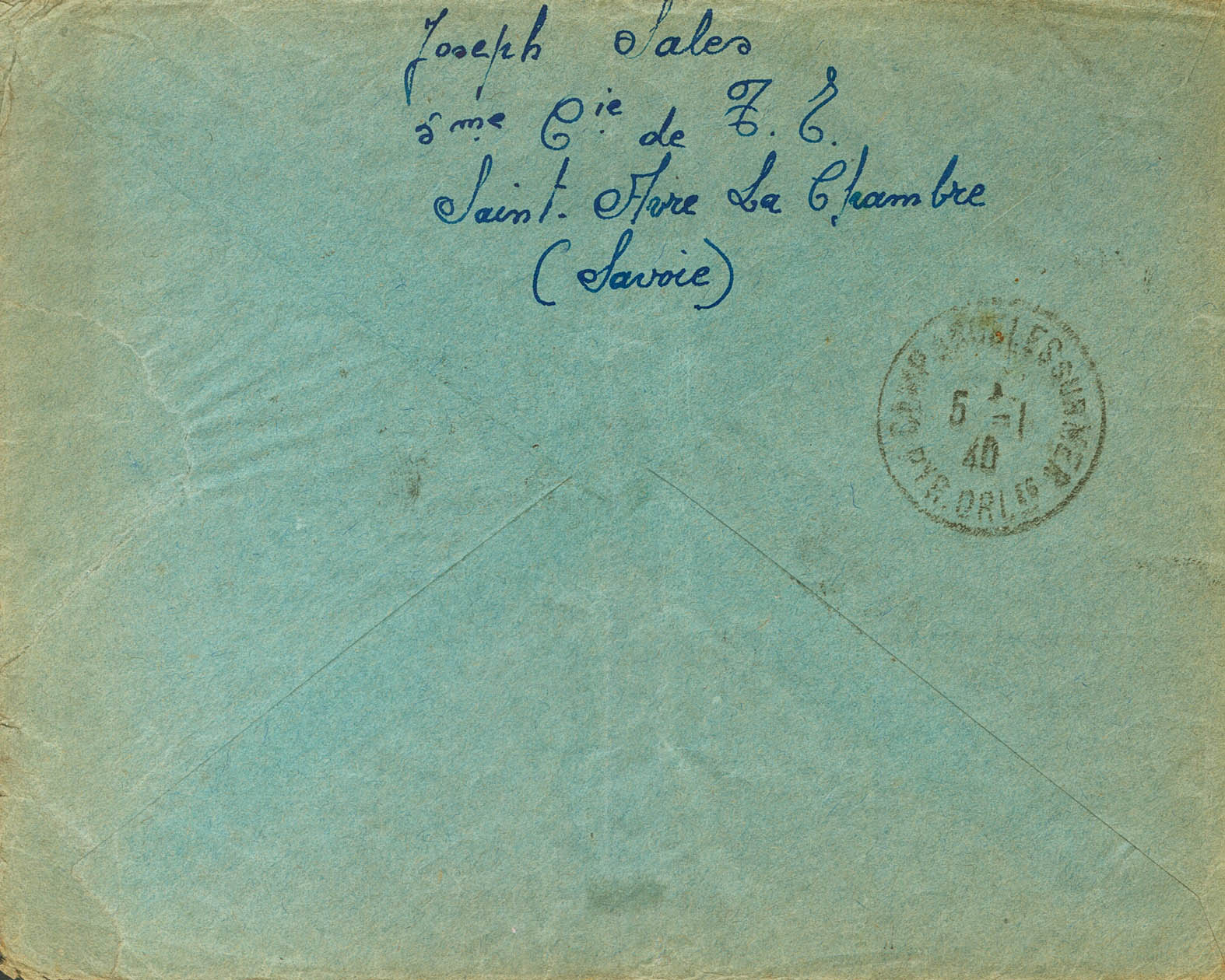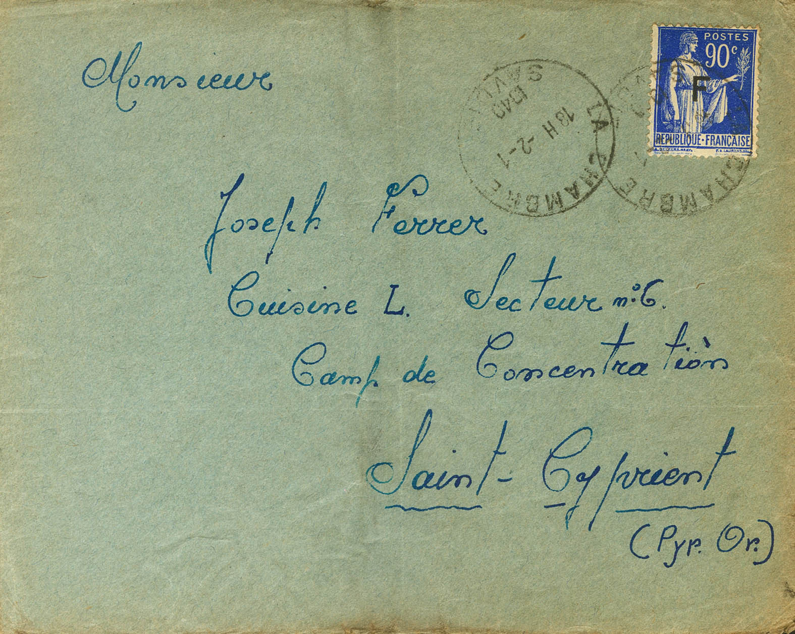 |ABOUT|1940. 90 cts blue from France, surcharge F. LA CHAMBRE to SAINT CYPRIEN, sent by a Spaniard from the 5th Company of Spanish Workers and addressed to the Saint Cyprien Concentration Camp. Arrival on the reverse. MAGNIFICENT AND RARE.