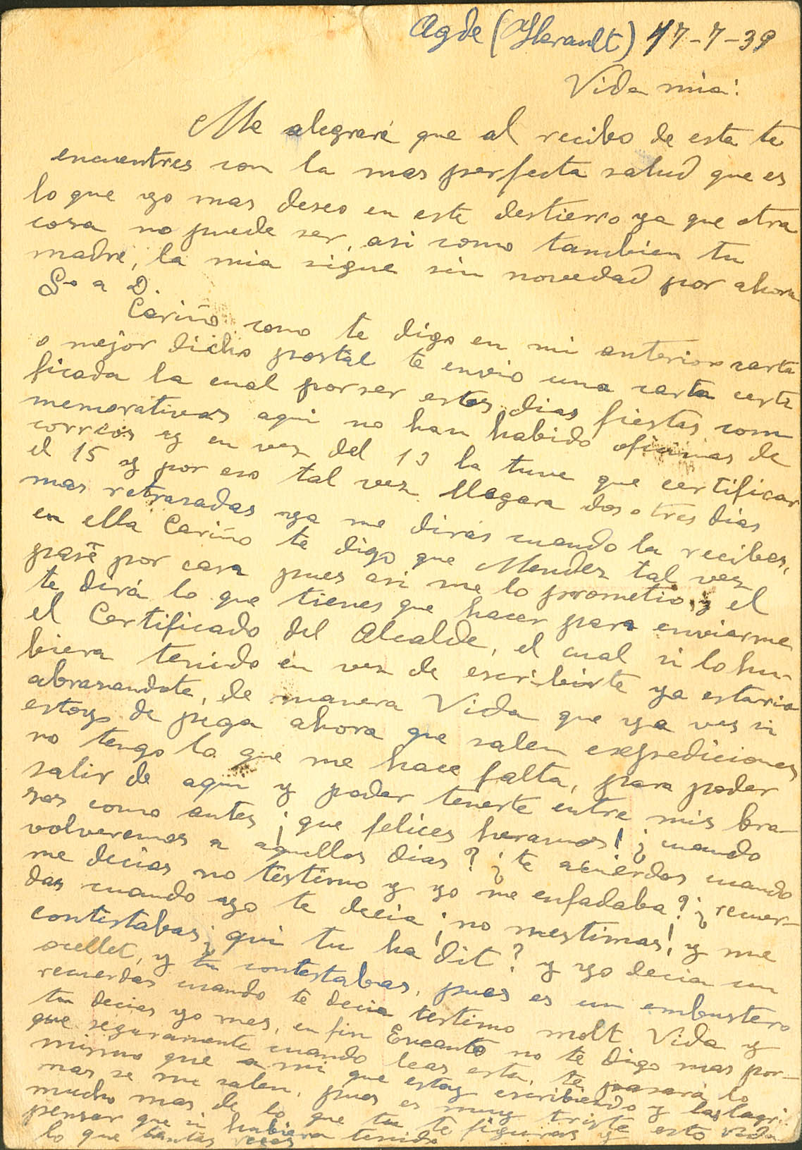 |ENVELOPE|1939. 70 cts lilac pink on French Postal Stationery Card from AGDE to BAGoodELONA, with additional postage of 25 cts green and 30 cts red, sent by a Spaniard interned in the Agde Concentration Camp. Postmark CAMP DE AGDE / HERAULT. MAGNIFICENT AND RARE USE OF POSTAL STATIONERY CARDS IN A SPANISH REFUGEE CAMP.