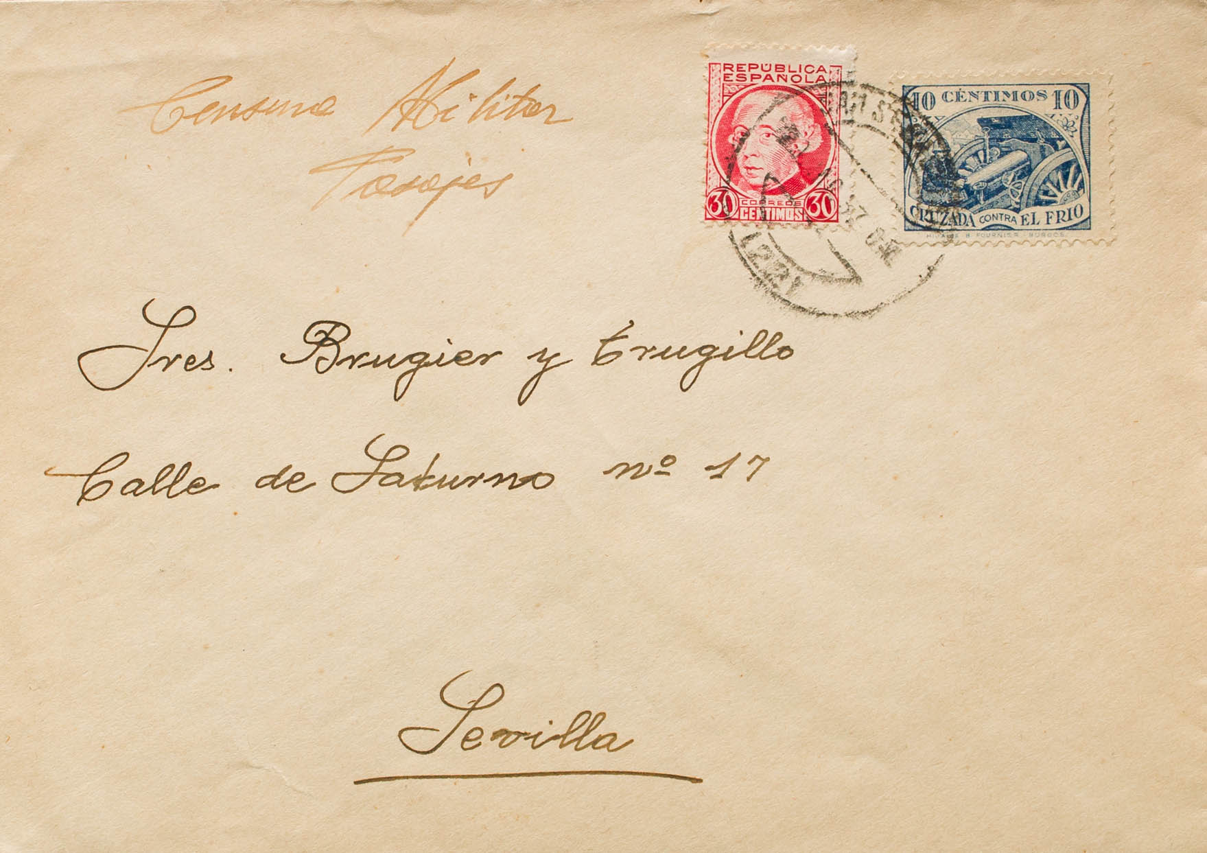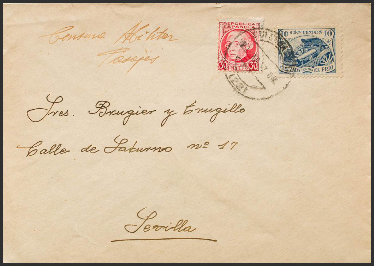 687. 1937. 30 cts carmine and 10 cts blue from Crusade Against the Cold. SAN SEBASTIAN to SEVILLE. On the front handwritten "Military Censorship Passages". MAGNIFICENT AND RARE.