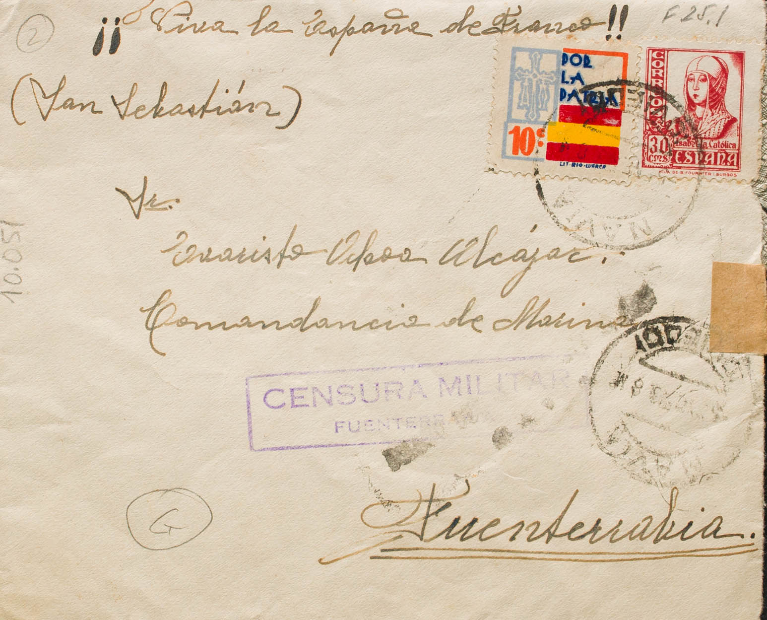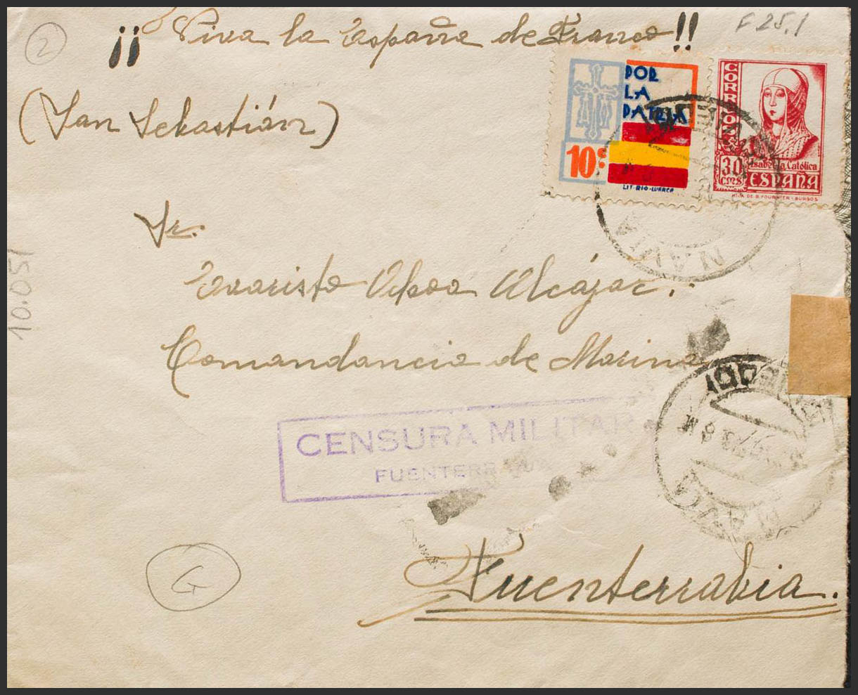 823. 1938. 30 cts carmine and Benefic 10 cts. SHIP to FUENTERRABIA. On the front it marks MILITARY CENSURE / FUENTERRABIA, in violet and arrival on the back. MAGNIFICENT.