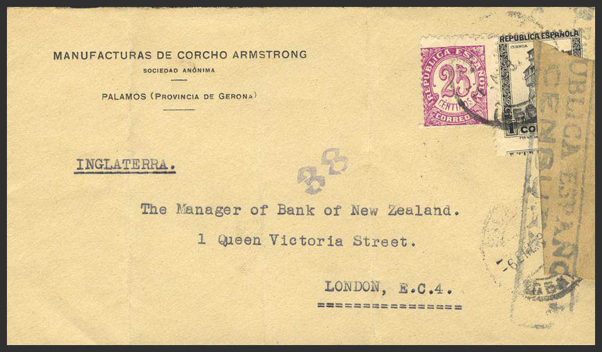 749,770. 1938. 25 cts and 1 pts. PALAMOS to LONDON. Postmark PALAMOS / GERONA, on the front SPANISH REPUBLIC / CENSURE.
