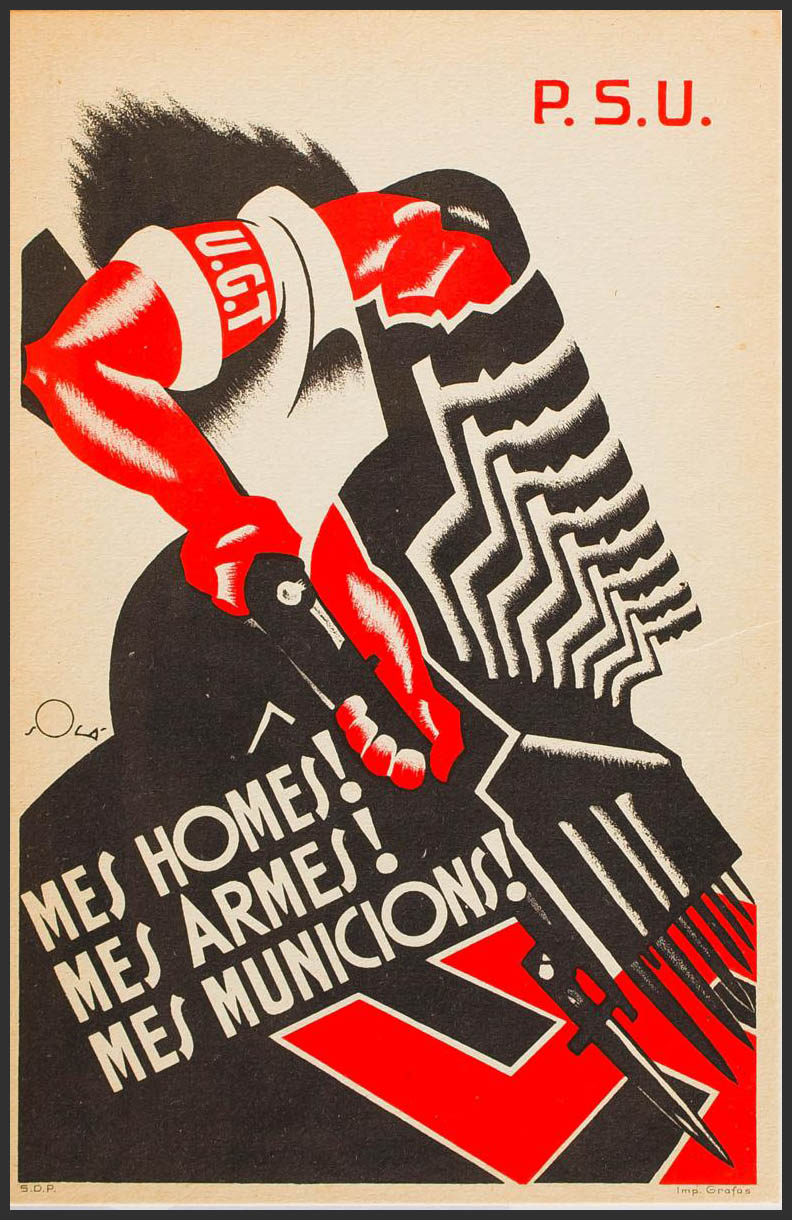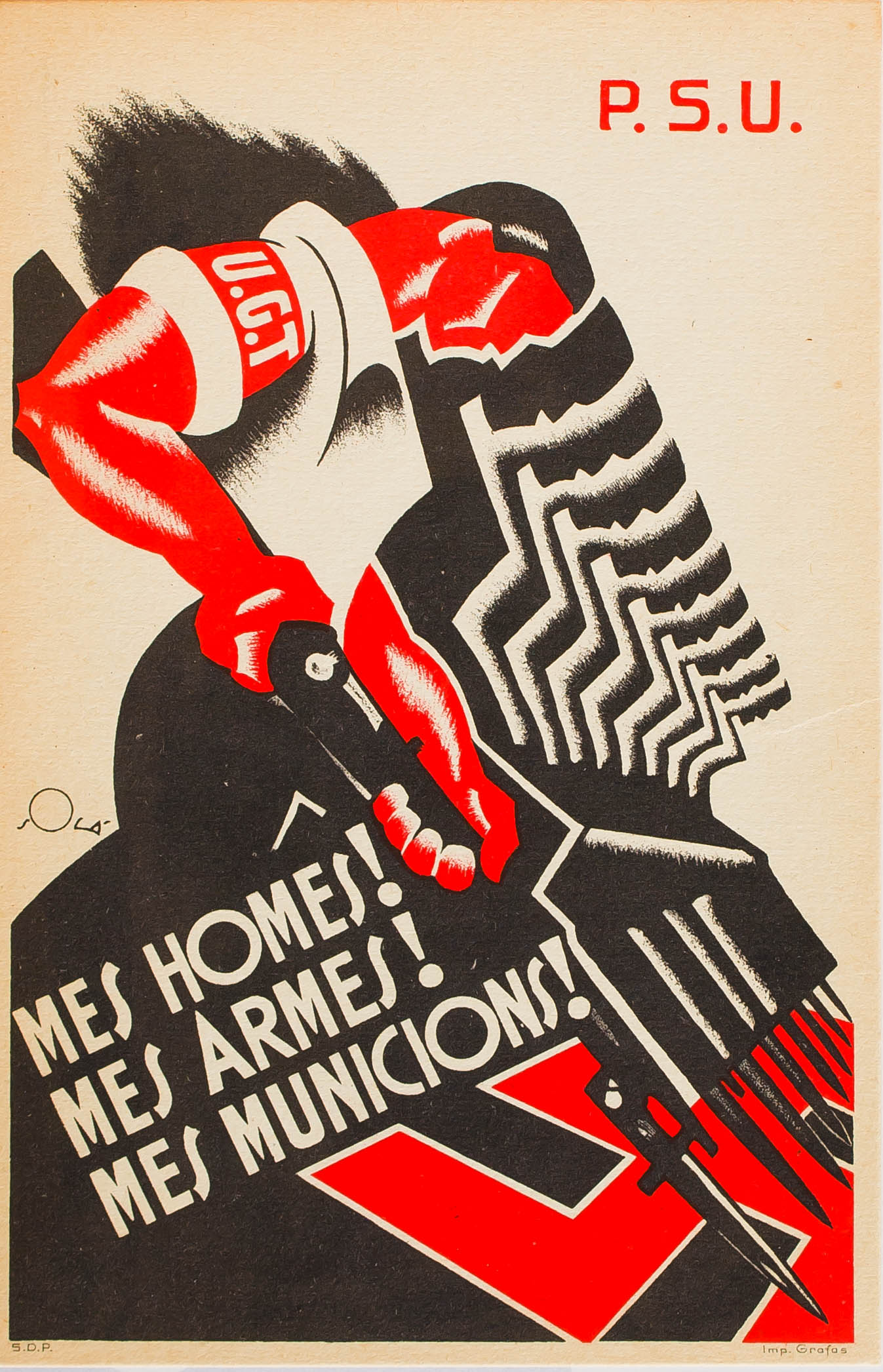 English (1937ca). Illustrated Postcard of the PSU- UGT MES HOMES! WEAPONS MONTH! MONTH AMMUNITION! MAGNIFICENT.