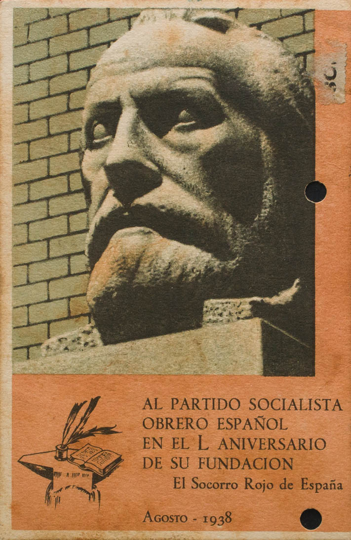 1938. Illustrated Postcard (with archival perforations). TO THE SPANISH SOCIALIST WORKERS' PARTY ON THE L ANNIVERSARY OF ITS FOUNDATION. THE RED HELP OF SPAIN AUGUST 1938. MAGNIFICENT AND VERY RARE.
