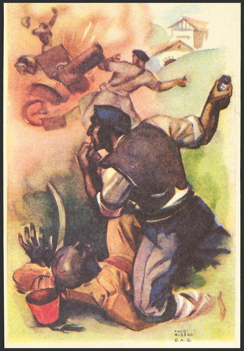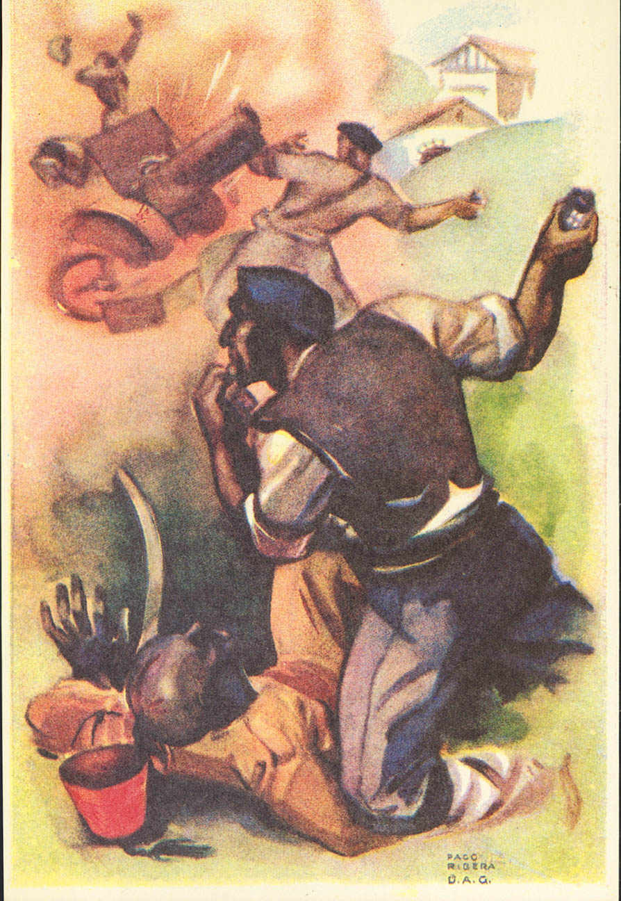 (★)(1937ca). Illustrated Postcard. EUZKADI. PEASANTS THROWING GRENADES. MAGNIFICENT AND RARE. (Allepuz, 829)