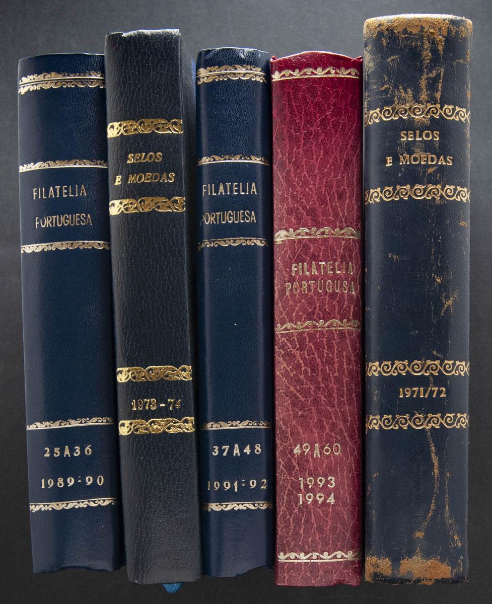 (1965ca). Conjunto de ocho volúmenes encuadernados de la revista portuguesa SELOS E MOEDAS desde el año 1965 (número 11) hasta 1986 (número 85) y cinco volúmenes encuadernados de la revista A FILATELIA PORTUGUESA, desde octubre de 1984 (número 0) hasta Diciembre de 1994 (número 60). A EXAMINAR. (Peso aproximado: 13 kilos)