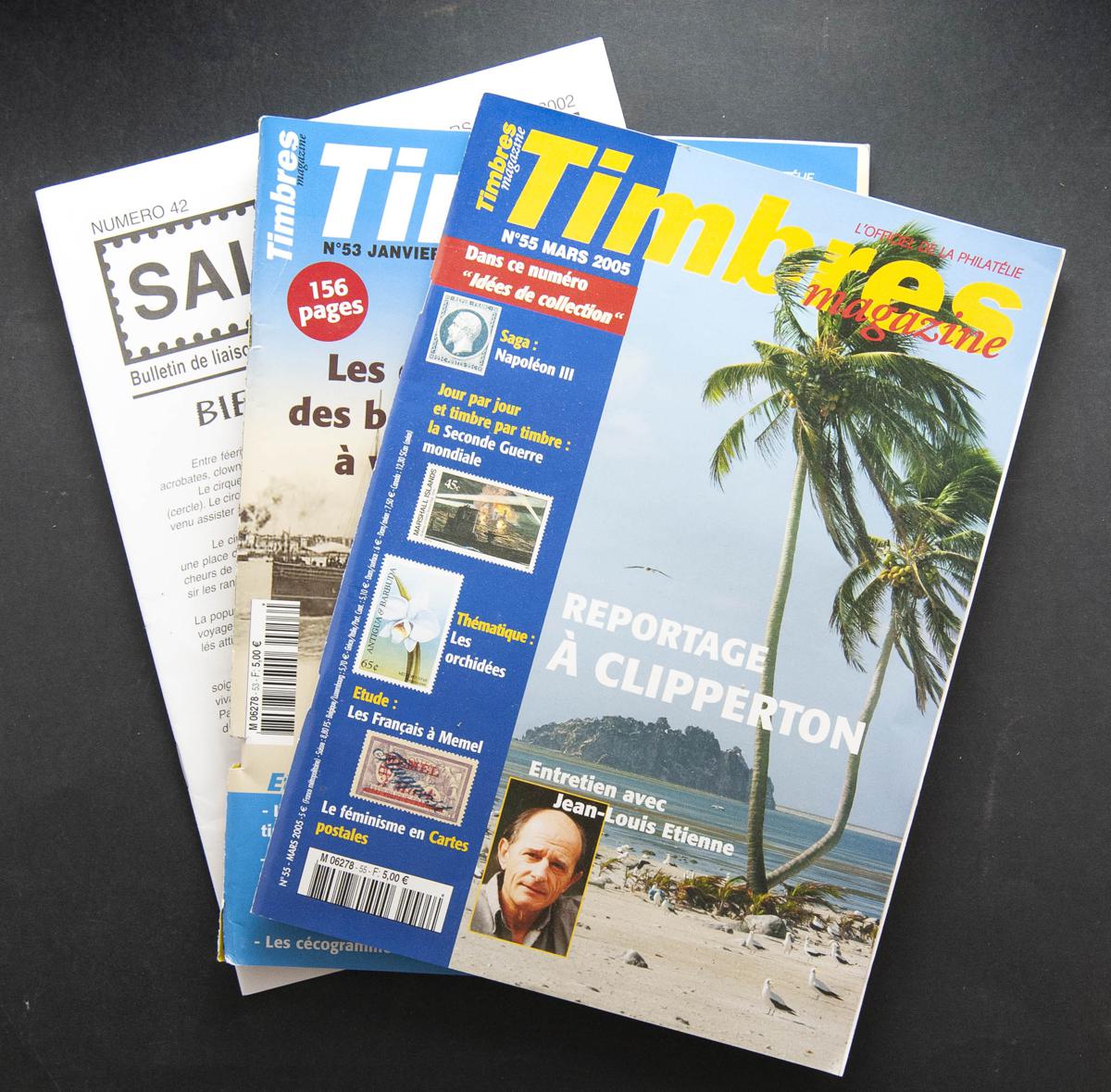 (1985ca). Conjunto voluminoso de revistas francesas formado por TIMBRES MAGAZINE (66 revistas, desde 2000 al 2006), LE MONDE DES PHILATELISTES (50 revistas, desde 1991 al 2000), LA PHILATELIE FRANÇAISE (38 revistas, desde 1985 al 2003), TIMBROSCOPIE (5 revistas, desde 1987 al 1999), SALM-PHILA (13 revistas, desde 2002 al 2006), LES DOSSIERS DE RELAIS (2 revistas, años 1997 y 2003), PHILATELIE MAGAZINE (3 revistas, del año 2001 y 2002) y BULLETIN AIJP (25 revistas, desde 1992 al 2003). A EXAMINAR. (Peso aproximado: 37 kilos)