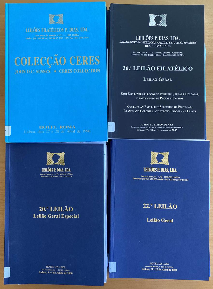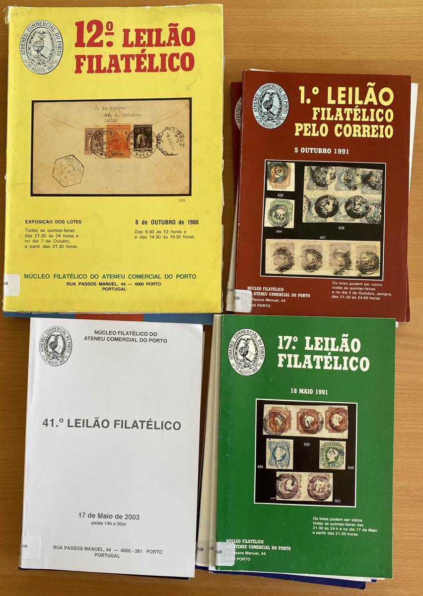(1945ca). Conjunto de catálogos de casas de subastas portuguesas: 19 catálogos de Leiloes P. Dias (subastas celebradas entre el año 1996 y 2005), 51 catálogos de O Selo (subastas celebradas entre el año 1945 y 1960) y 13 de Nucleo Filatelico Do Ateneu Comercial Do Porto (subastas celebradas entre el año 1988 y 2003). A EXAMINAR. (Peso aproximado: 21 kilos)