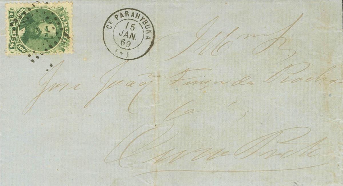 Yvert 27A. 1869. 100 reis verde sobre blanco. PARAHYBUNA a OURO PRETO. Matasello ROMBO DE PUNTOS, en el frente fechador CE.PARAHYBUNA / (*). MAGNIFICA.