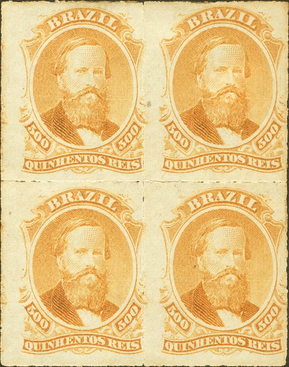 ★Yvert 36(4). 1876. 500 reis naranja, bloque de cuatro. BONITO Y MUY RARO.