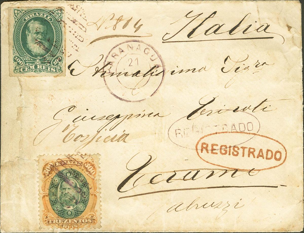 Yvert 41, 47. 1881. 100 reis verde y 300 reis naranja y verde. Certificado de PARANAGUA a TERAMO (ITALIA), reexpedida a TOSSICIA. Matasello oval de barras y en el frente raro fechador PARANAGUA, en violeta y marca REGISTRADO, en dos colores, al dorso tránsito RIO DE JANEIRO y llegadas. MAGNIFICA Y MUY RARA.