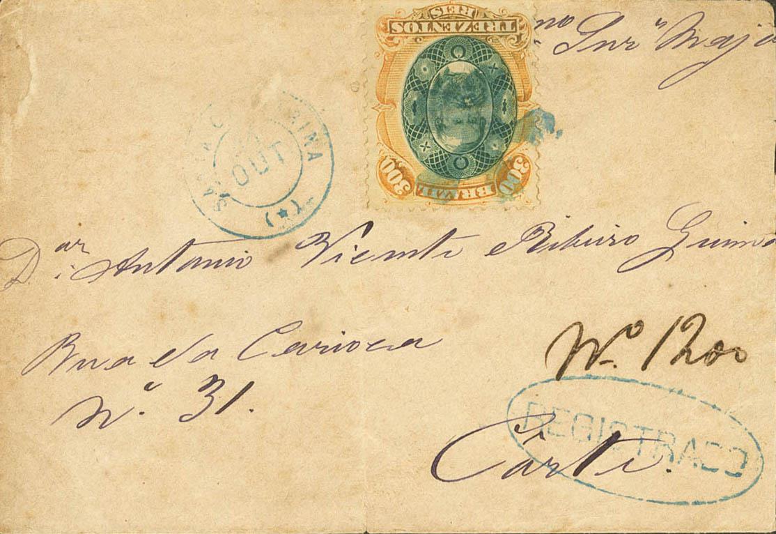 Yvert 47. (1880ca). 300 reis naranja y verde. Certificado de SANTA CATARINA a RIO DE JANEIRO. Matasello aspas, en azul y en el frente fechador SANTA CATARINA y REGISTRADO, en azul. BONITA Y RARA.