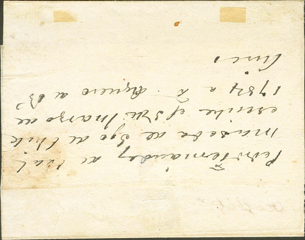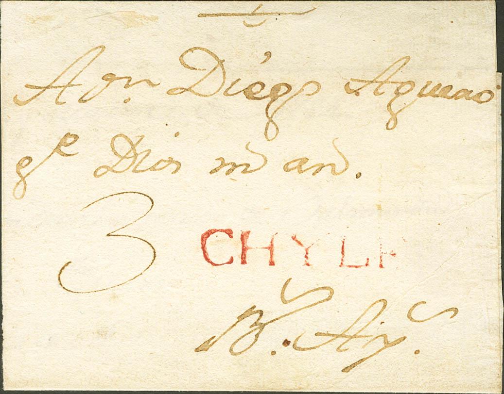 1784. SANTIAGO DE CHILE a BUENOS AIRES (ARGENTINA). Marca CHYLE, en rojo del periodo colonial español (P.E.1) edición 2004 y porteo '3' manuscrito. MAGNIFICA Y RARISIMA.