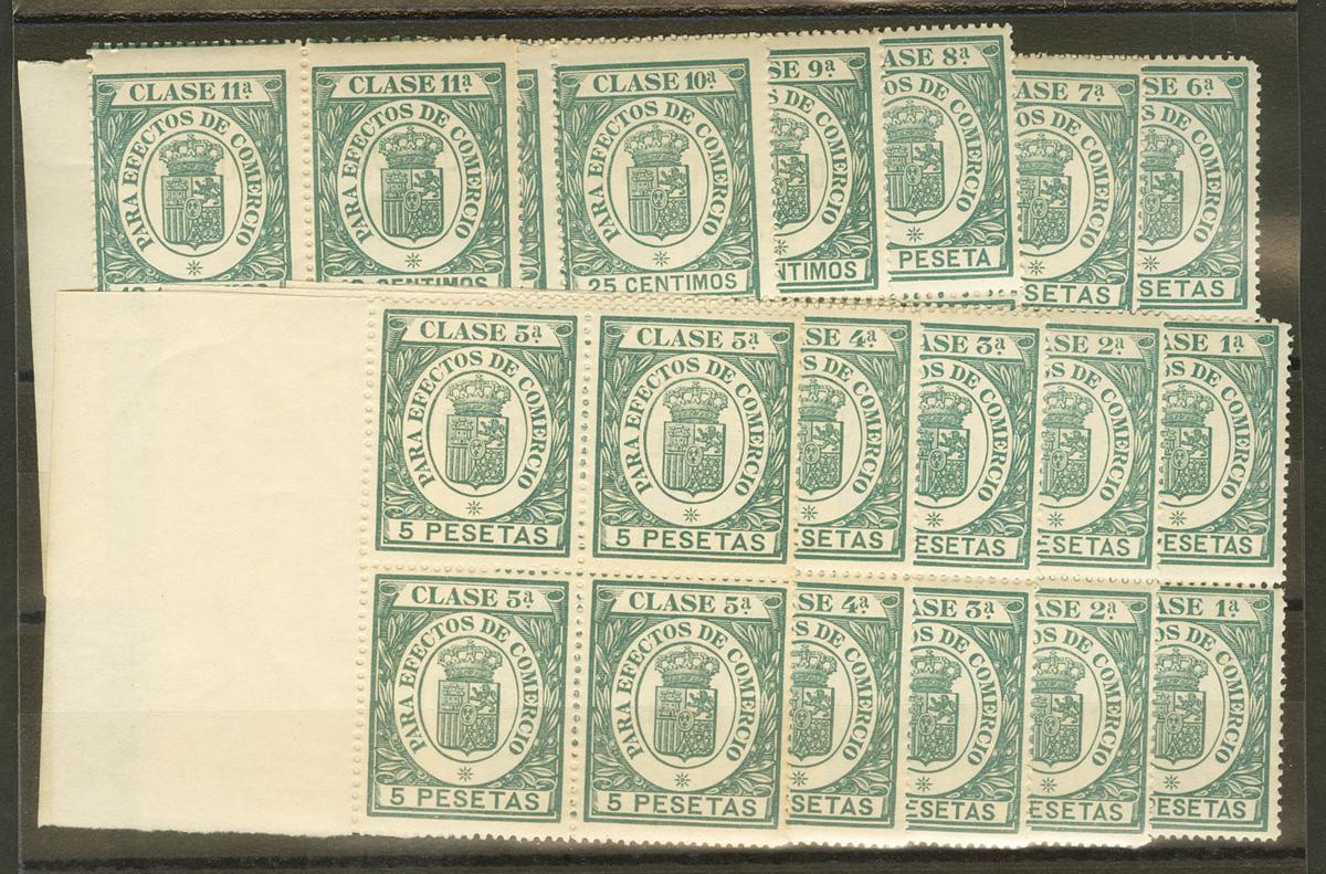 ★★1919. Serie completa EFECTOS DE COMERCIO, once valores, bloques de cuatro. NºA000.000. MAGNIFICA. (Alemany 81/91)