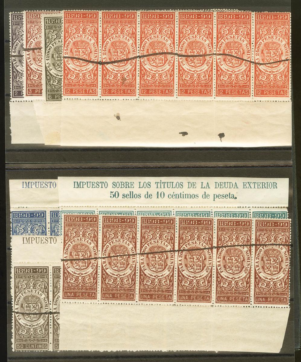 ★★/★1898. Serie completa DEUDA EXTERIOR, ocho valores, tira de seis, borde de hoja. Inutilizados a pluma procedentes de la hoja MUESTRA. MAGNIFICA Y RARA. (Alemany 17/24)
