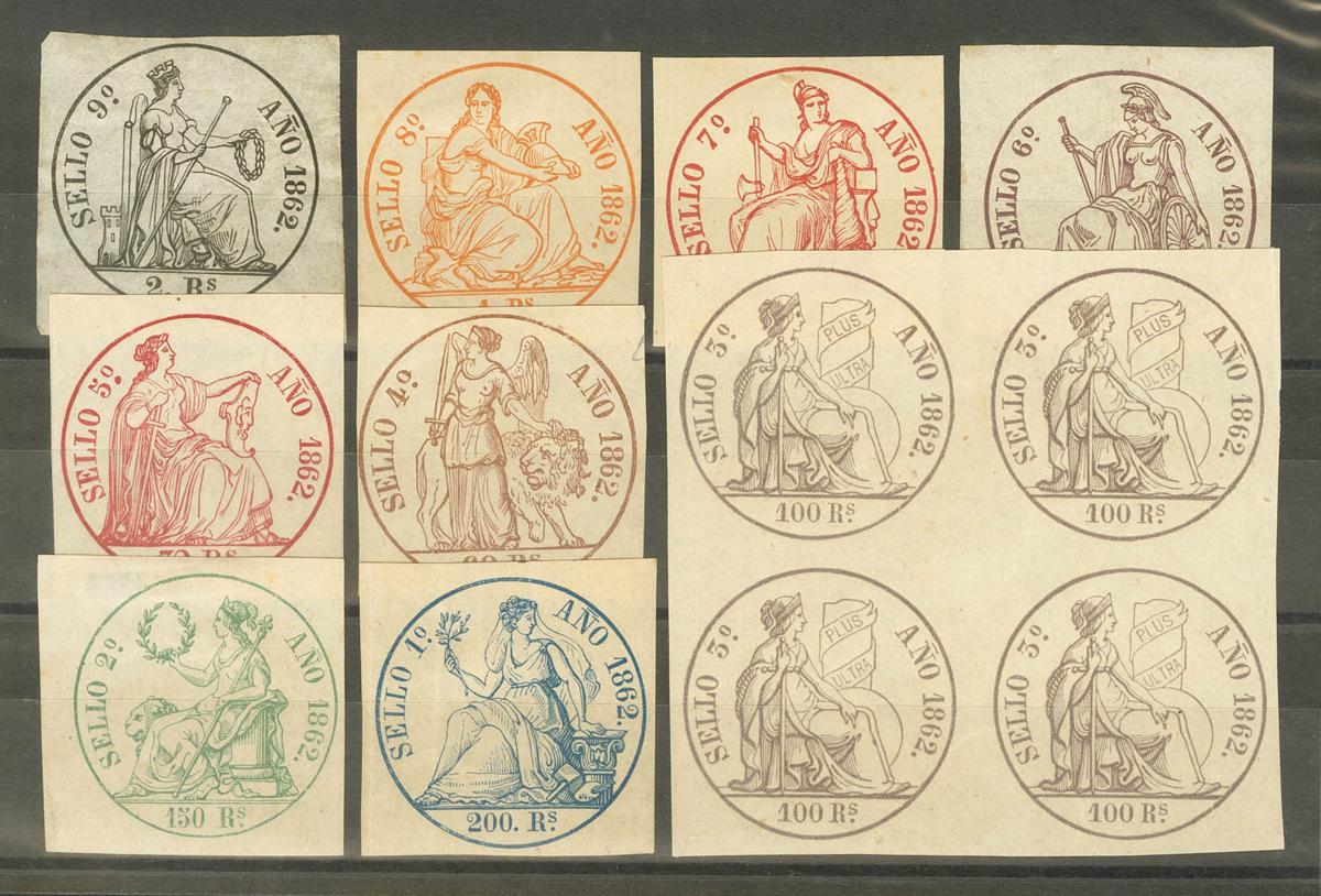 ★/(★)1862. Serie completa, nueve valores (el 100 reales en bloque de cuatro). POLIZAS. MAGNIFICA Y RARA. (Alemany 25/33)