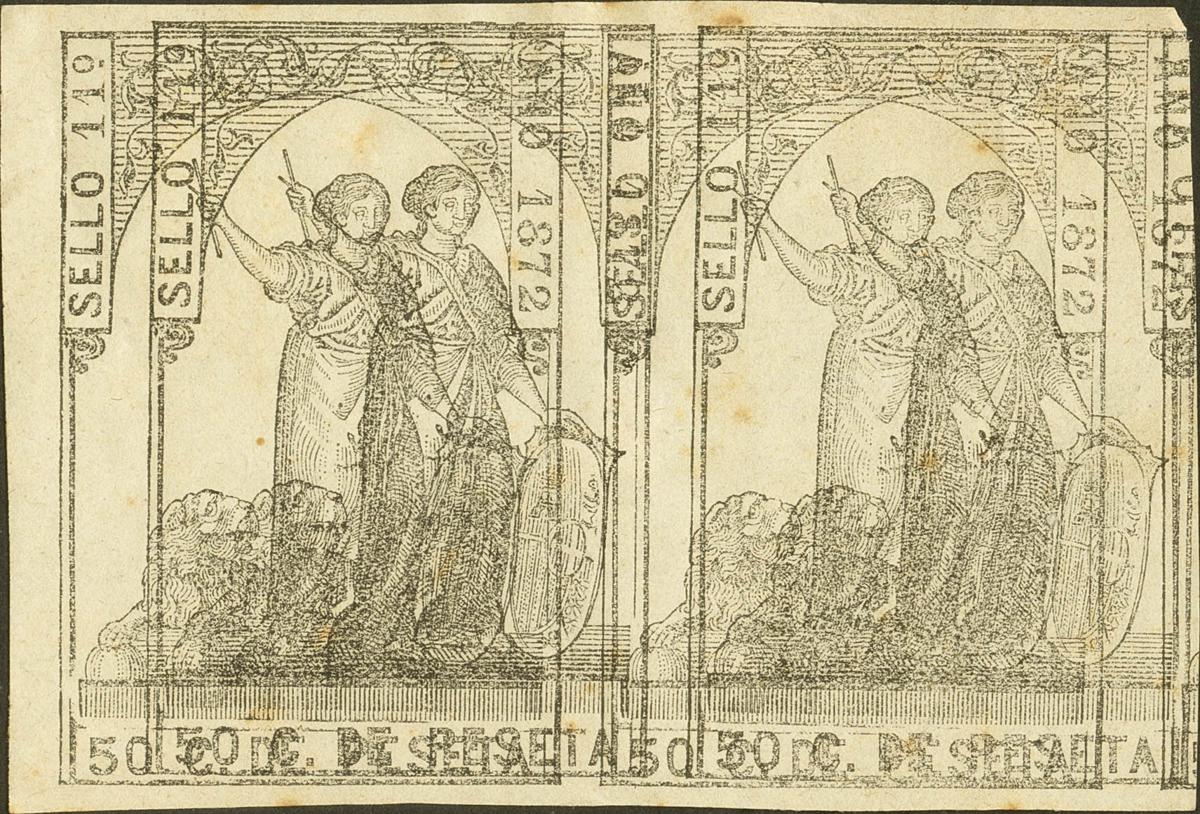 (★)1872. 50 cts negro DOBLE IMPRESION, pareja. POLIZAS. BONITA. (Alemany 117)