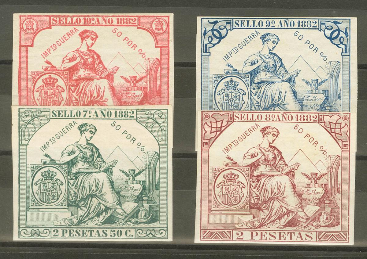 ★1882. Serie completa, a falta del 50 cts negro. POLIZAS. IMPUESTO DE GUERRA. MAGNIFICA Y MUY RARA. (Alemany 240/43)