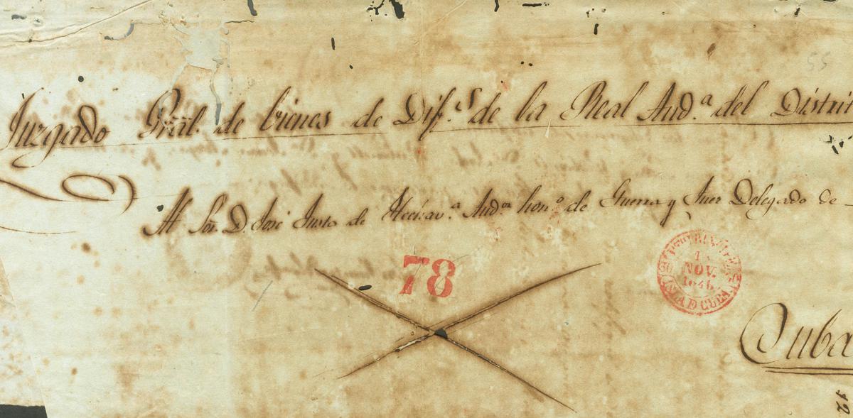 1846. Plica Judicial de PUERTO PRINCIPE a SANTIAGO DE CUBA (tropicalización en la parte superior). Baeza PTO.PRINCIPE / ISLA DE CUBA, en rojo. BONITA.