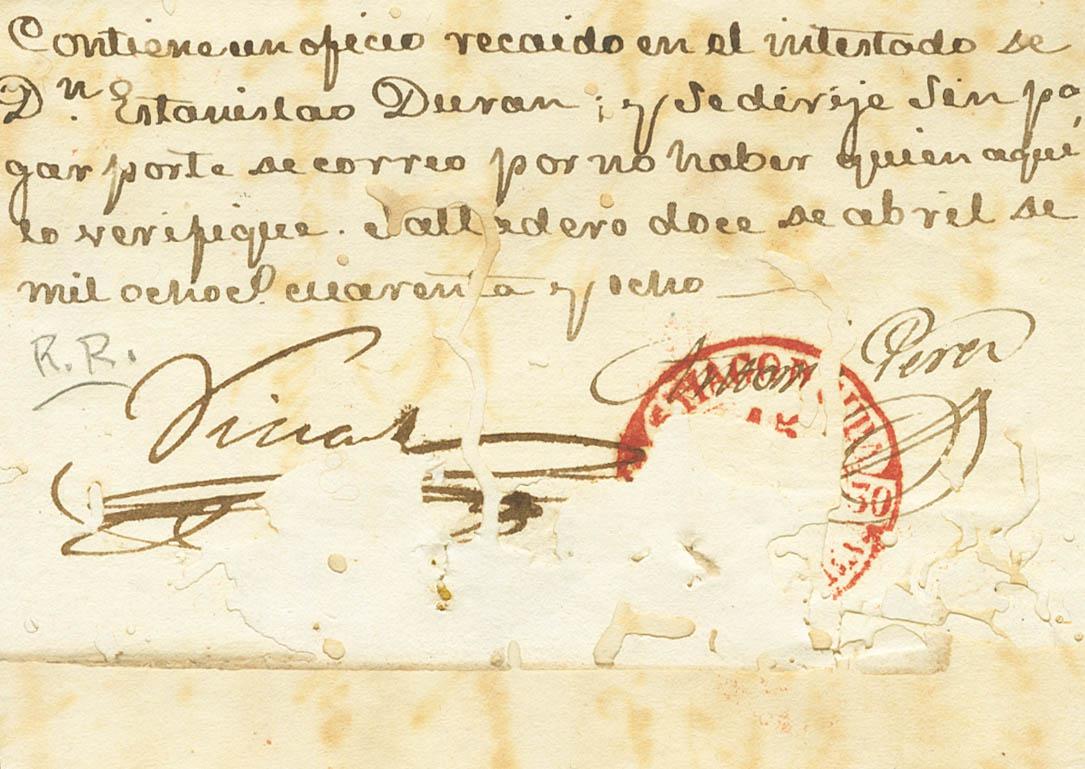 1848. SANTA CATALINA DEL SALTADERO a SANTIAGO DE CUBA. Baeza STA.CATALINA / ISLA DE CUBA, en rojo. MAGNIFICA Y MUY RARA.