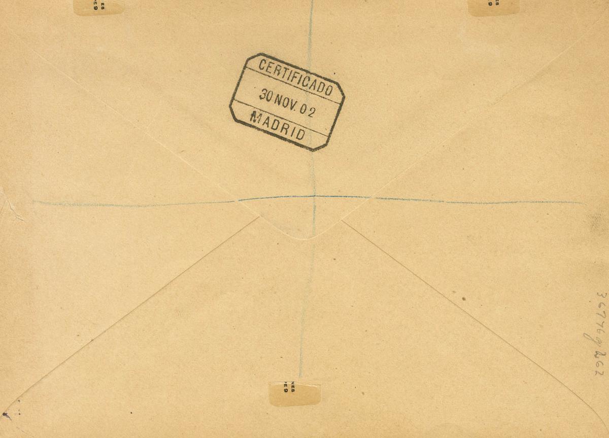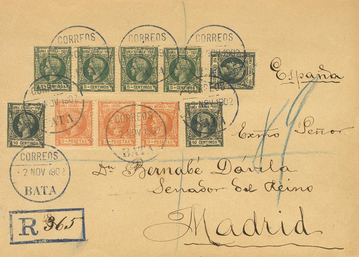 1(4), 2(3), 8(3). 1902. 5 cts verde, cuatro sellos, 10 cts azul, tres sellos y 5 pts bermellón, tira de tres. Certificado de BATA a MADRID. Matasello CORREOS / BATA, en azul y al dorso llegada. MAGNIFICA Y ESPECTACULAR FRANQUEO, POSIBLEMENTE UNICA CONOCIDA CON UN MULTIPLO DEL VALOR CLAVE. Cert. GRAUS.