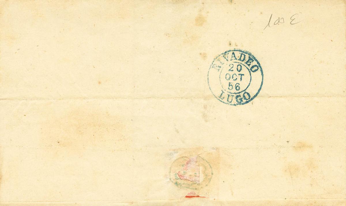 48. 1856. 4 cuartos rojo. MUROS (LA CORUÑA) a RIBADEO. Matasello PARRILLA, en azul y en el frente marca prefilatélica MUROS / GALICIA, en azul. MAGNIFICA.