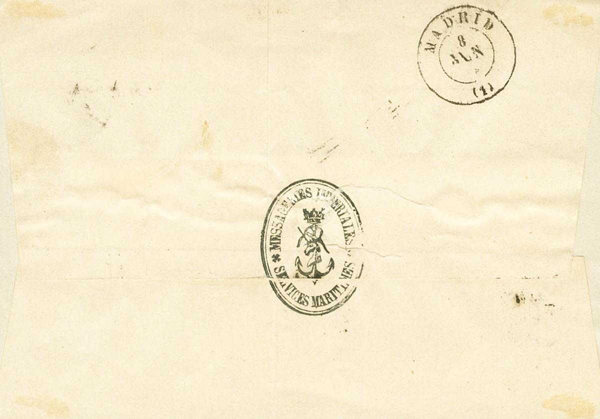 48. 1859. 4 cuartos rojo. ISLAS BALEARES (dato no confirmado) a MADRID. Al dorso marca MESSAGERIES IMPERIALES / SERVICES MARITIMES, esta empresa con delegación en Alicante recortaba en dos o tres días el tránsito entre Baleares y Madrid, la correspondencia se redirigía privadamente hasta Alicante desde Mallorca y allí la depositaban en el ambulante. MAGNIFICA Y RARA.