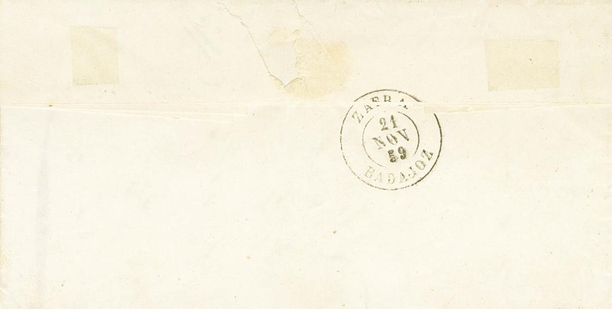 48. 1859. SANTA MARTA DE LOS BARROS a ZAFRA. Matasello LOS SANTOS / BADAJOZ. MAGNIFICA Y ESPECTACULAR ESTAMPACION Y MUY RARA.