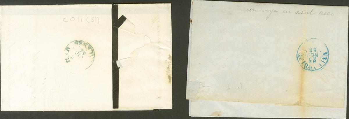 1854. Conjunto de dos cartas circuladas con el 4 cuartos rojo, ambas con origen en MADRID y destino TRUJILLO y VALLADOLID, respectivamente, las dos carta en el frente fechador especial MADRID (Tipo pequeño y con la variante con punto después de Madrid, ambos reseñados en la obra de Sitjá), en color negro y azul (el color en azul presenta línea horizontal), respectivamente. MAGNIFICAS.