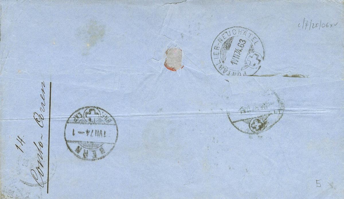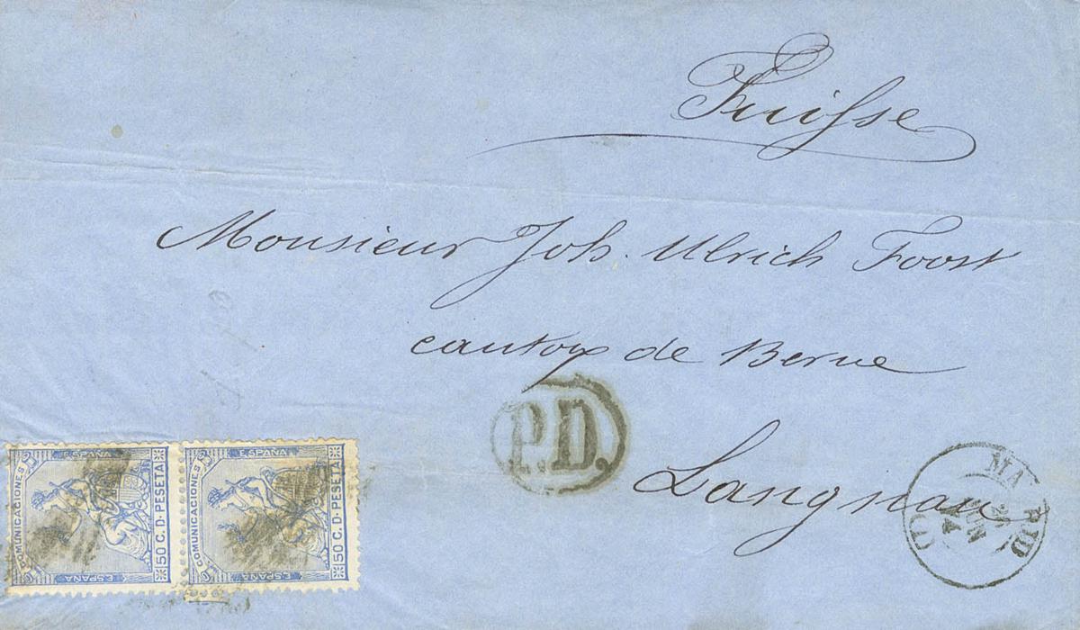 137(2). 1874. 50 cts ultramar. MADRID a LANGNAU (SUIZA). MAGNIFICA E INUSUAL FRANQUEO DE DOBLE PORTE A SUIZA.