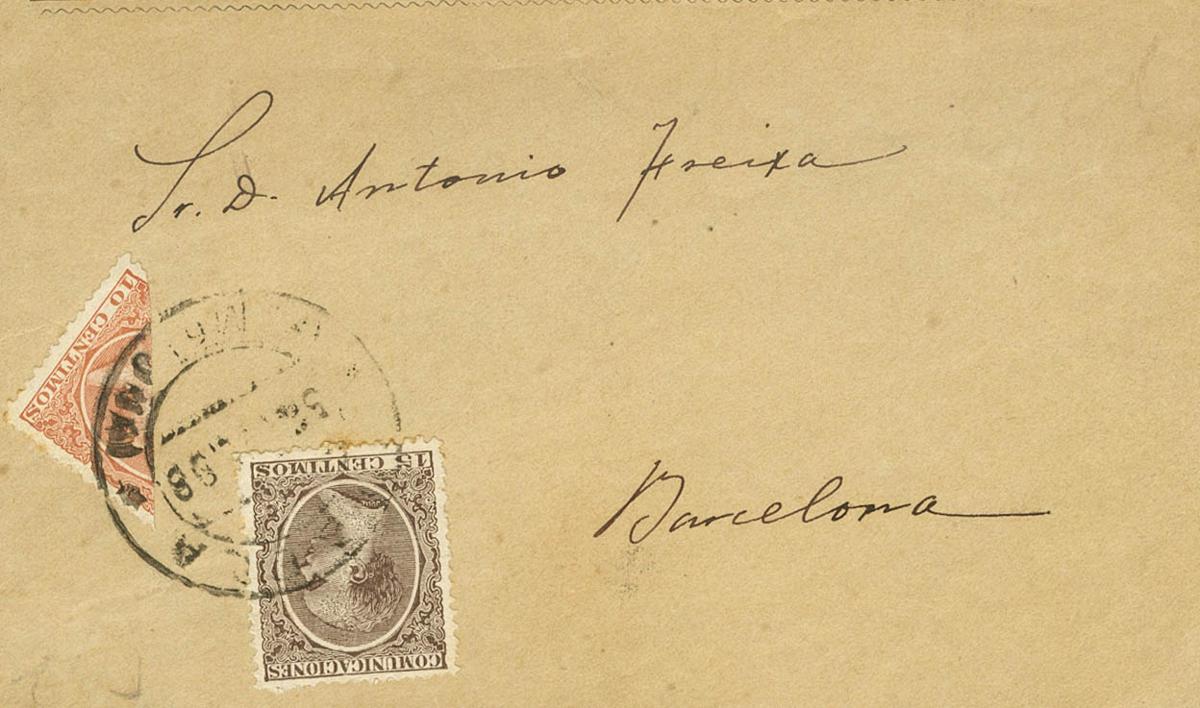 217, 219. 1898. 10 cts castaño amarillo, BISECTADO y 15 cts castaño lila. Frontal dirigido a BARCELONA. MAGNIFICO Y RARO FRANQUEO.