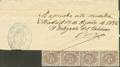 ★★/★1895. 10 cts violeta TIMBRE MOVIL, tira de cuatro, borde de hoja. En el margen anotación manuscrita "Se aprueba esta Muestra" y marca DELEGACION DEL GOBIERNO EN EL ARRENDAMIENTO DE TABACO, en azul. MAGNIFICA. (Alemany 40)