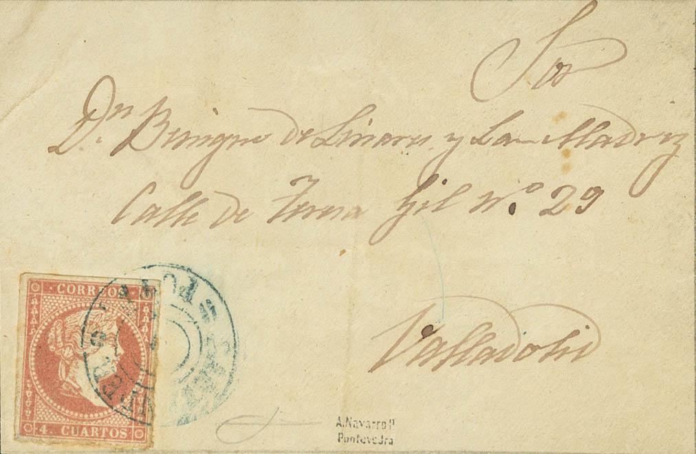 48. 1859. 4 cuartos rojo. Frontal de POTES (SANTANDER) a VALLADOLID. Matasello especial SANTANDER / POTES, en azul. MAGNIFICO Y RARO.