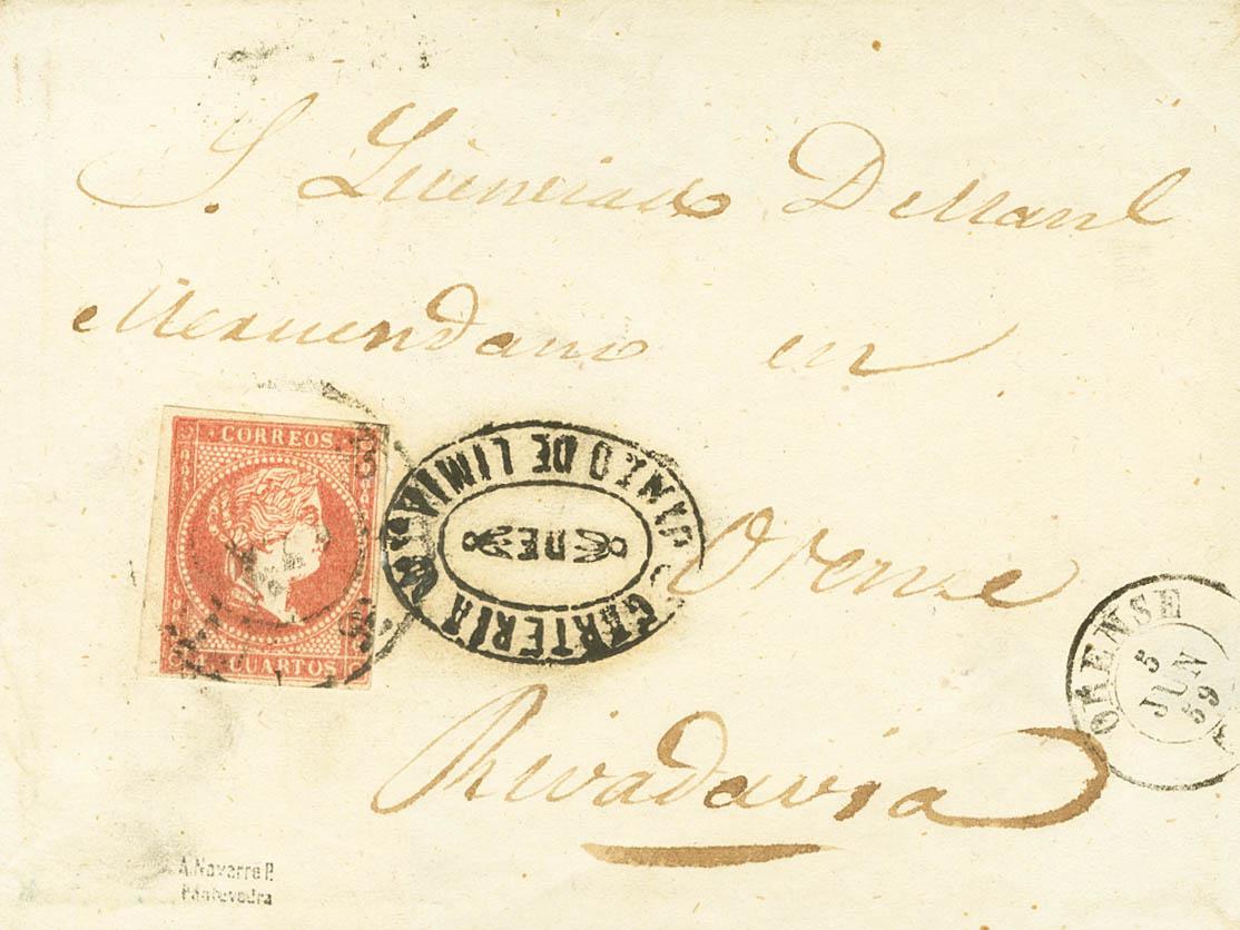 48. 1859. 4 cuartos rojo. GINZO DE LIMIA (ORENSE) a RIVADABIA. En el frente marca CARTERIA / DE / GINZO DE LIMIA. MAGNIFICA Y PRIMERA MARCA CON EL USO DE LA DENOMINACION "CARTERIA".