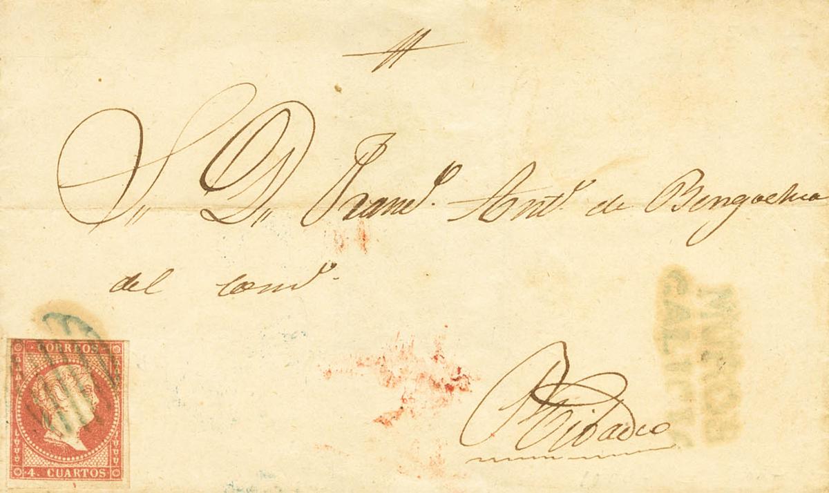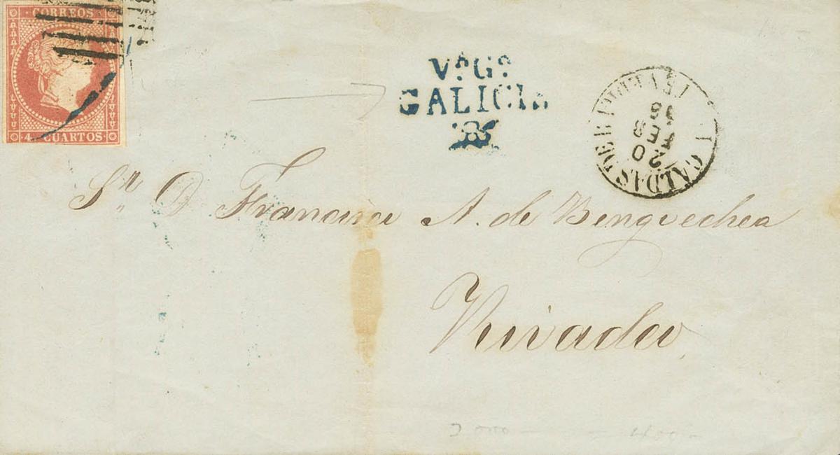 48. 1858. 4 cuartos rojo. VILLAGARCIA DE AROSA a RIBADEO. En el frente marca prefilatélica VªGª / GALICIA, en negro. MAGNIFICA Y RARA EN ESTE COLOR.